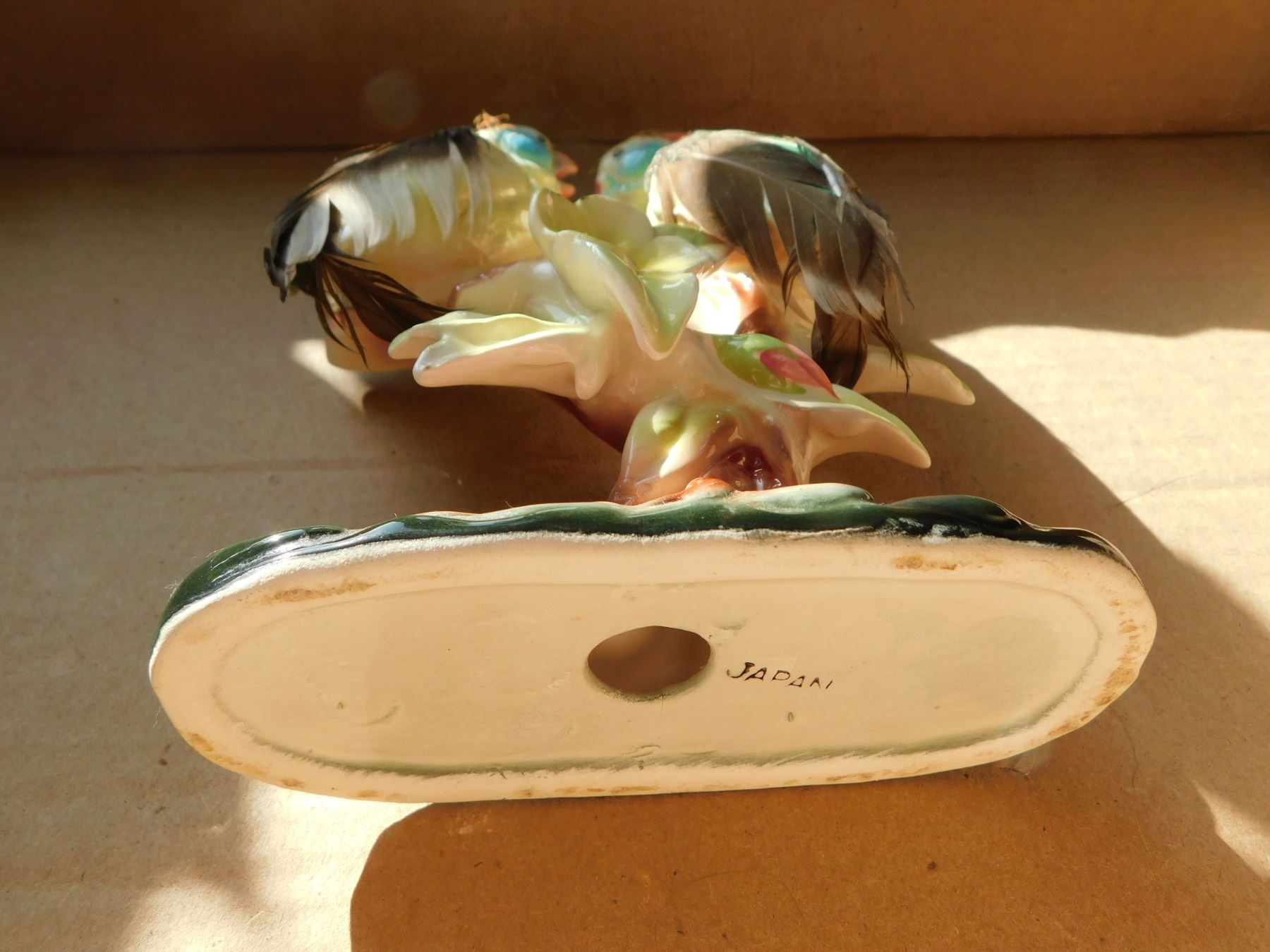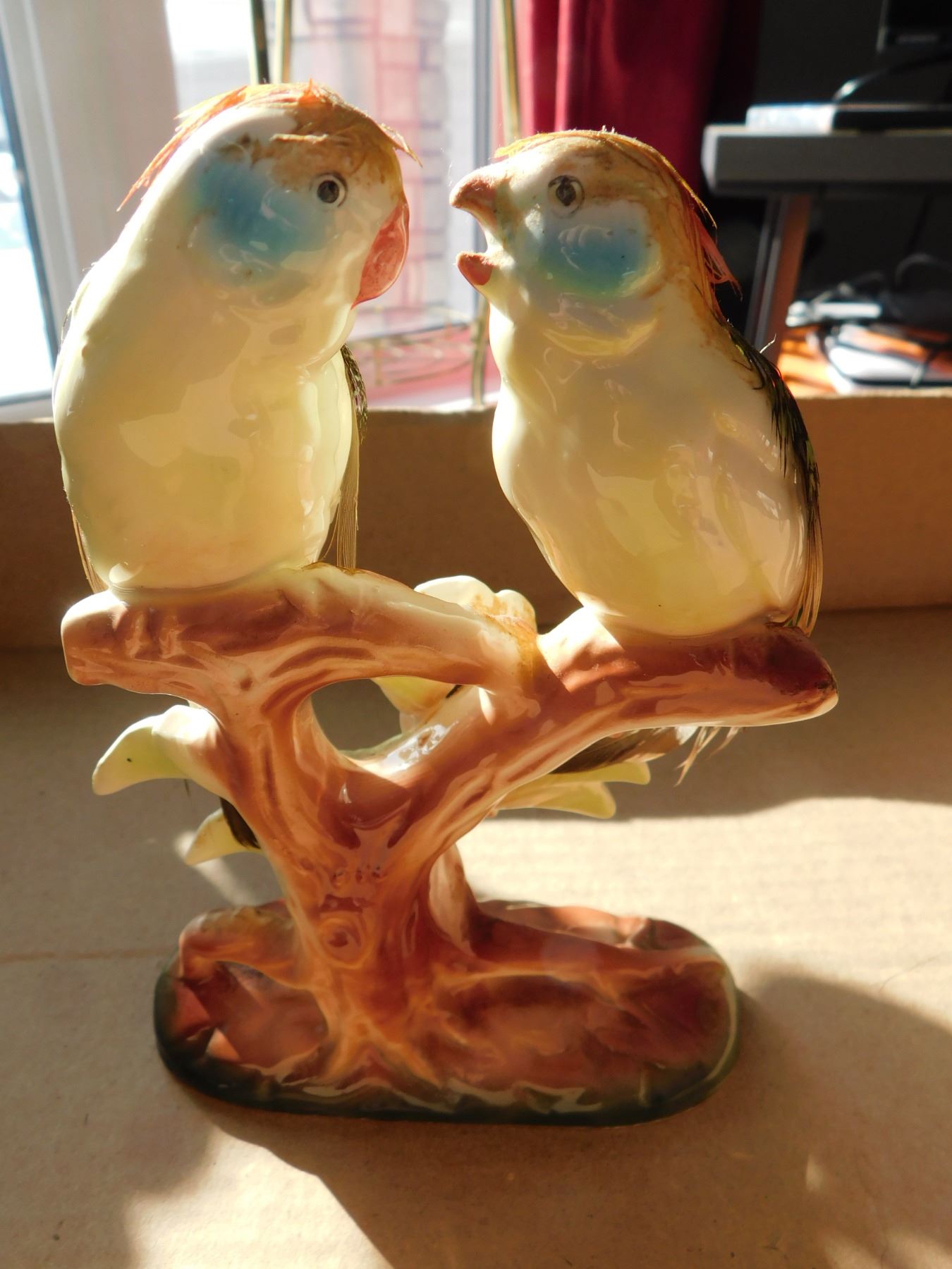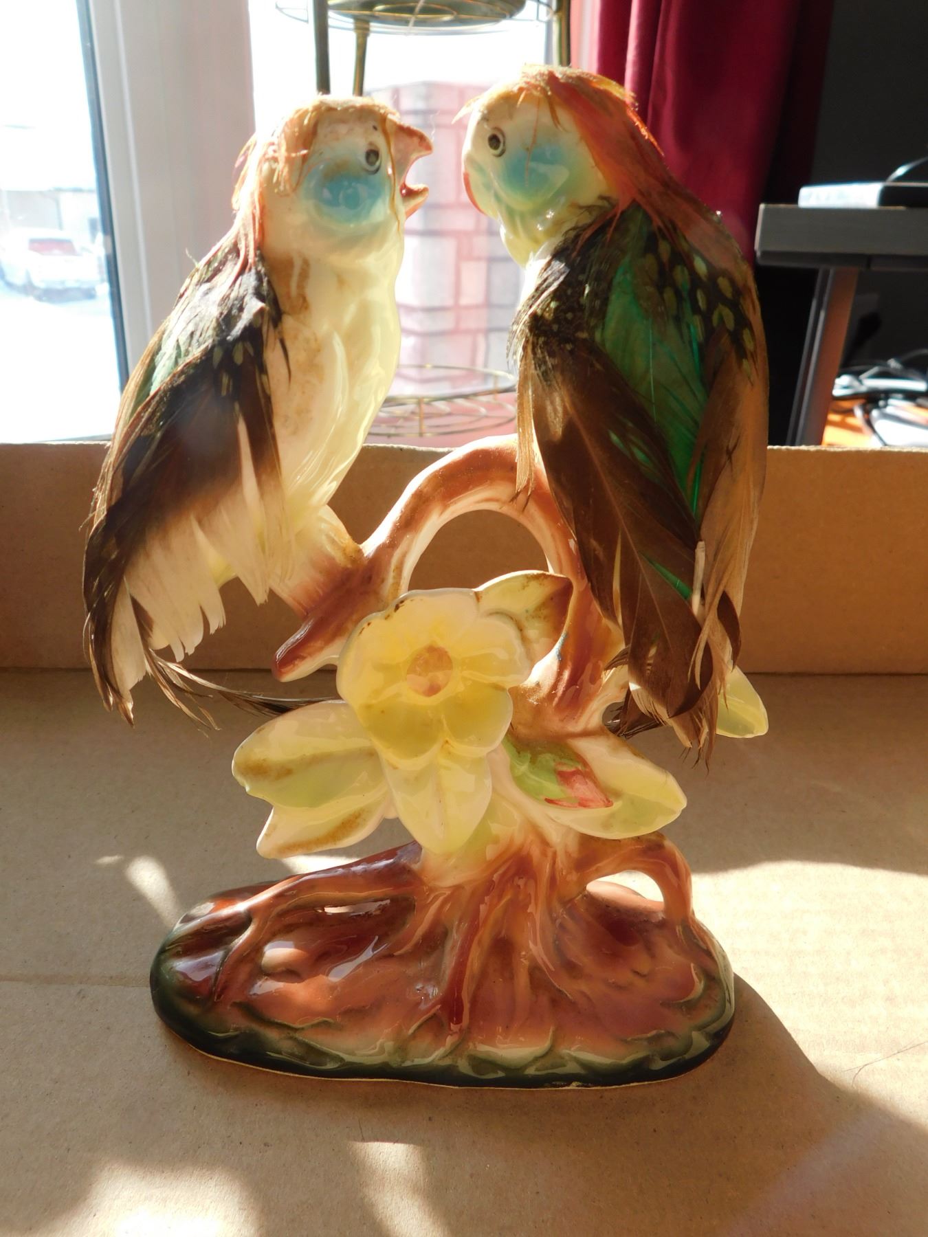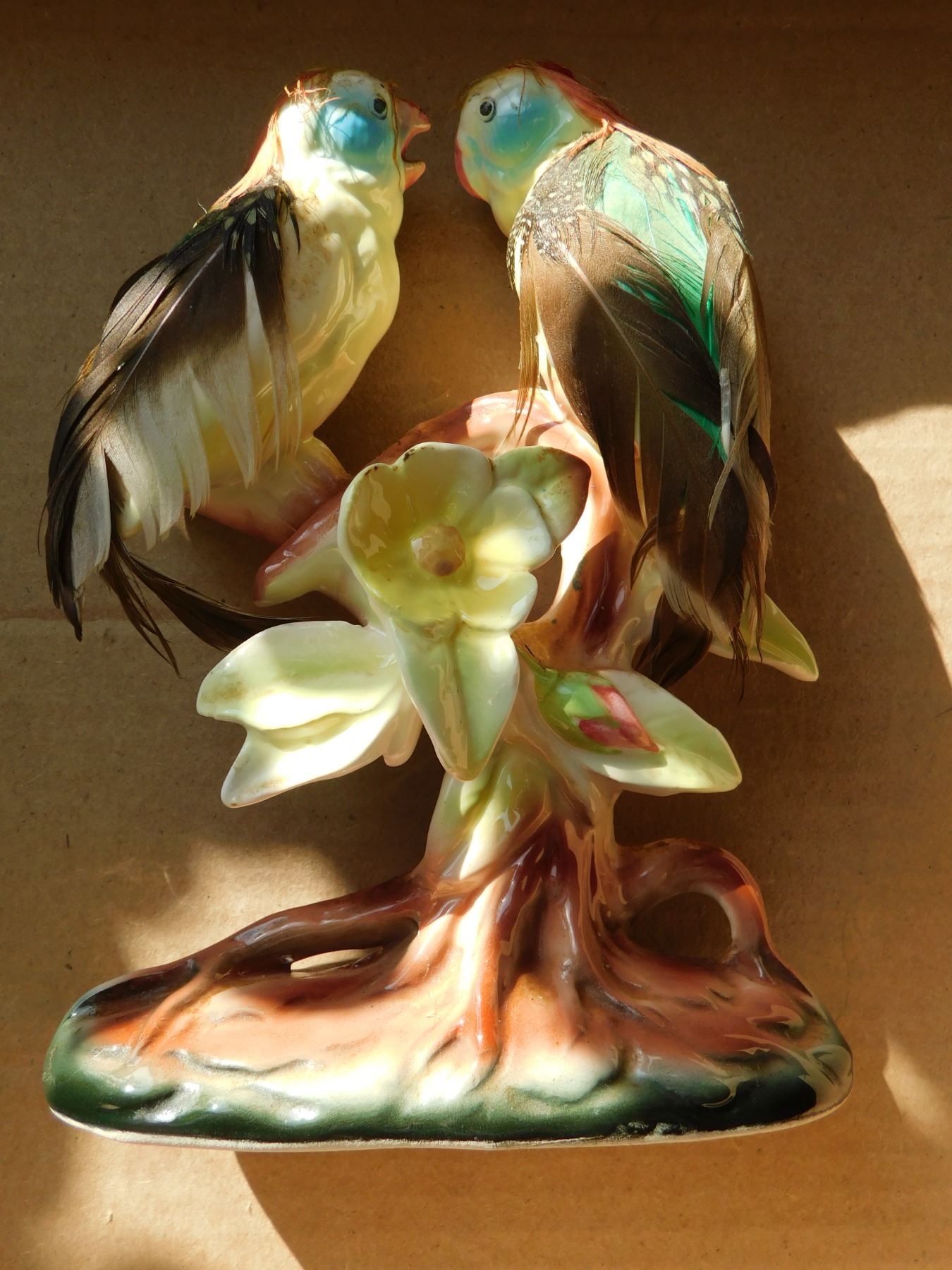CERAMIC PARAKEET WITH REAL FEATHERS, SCARCE BUDGIGAR