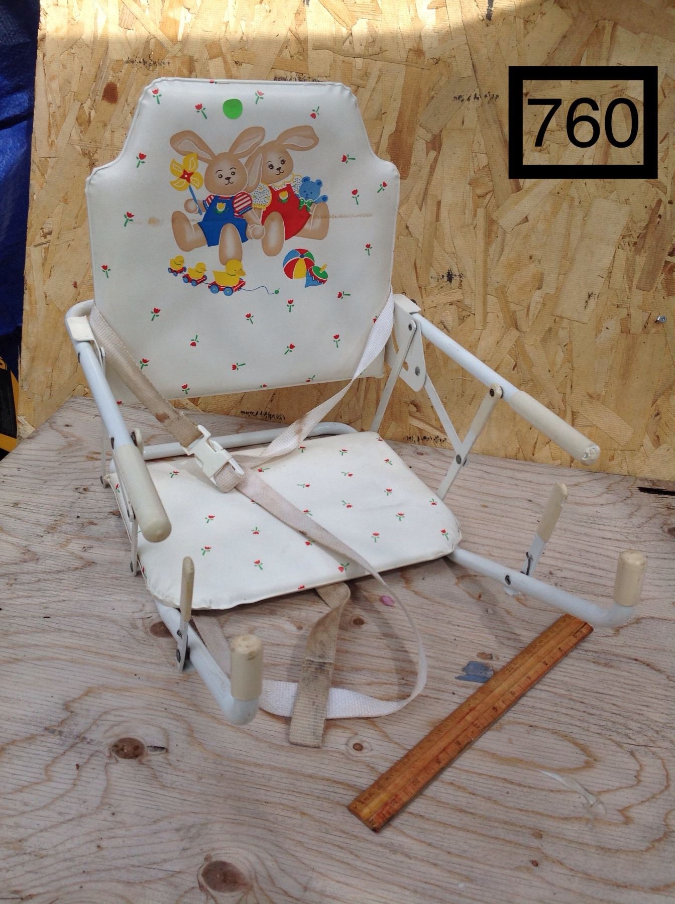 CHILD'S FOLDING CHAIR. ATTACHES TO TABLE. METAL & VINYL
