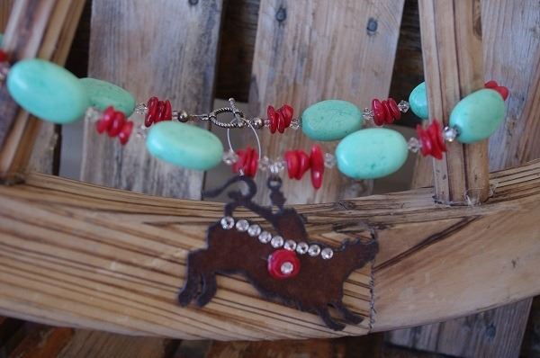 CHUNKY GREEN STONE NECKLACE WITH BUCKING BULL/Chunky necklace with metal bucking bull pendant Clear crystals and red flower on pendant Red and green stones and clear beads on necklace/9"NECKLACE,2" PENDANT