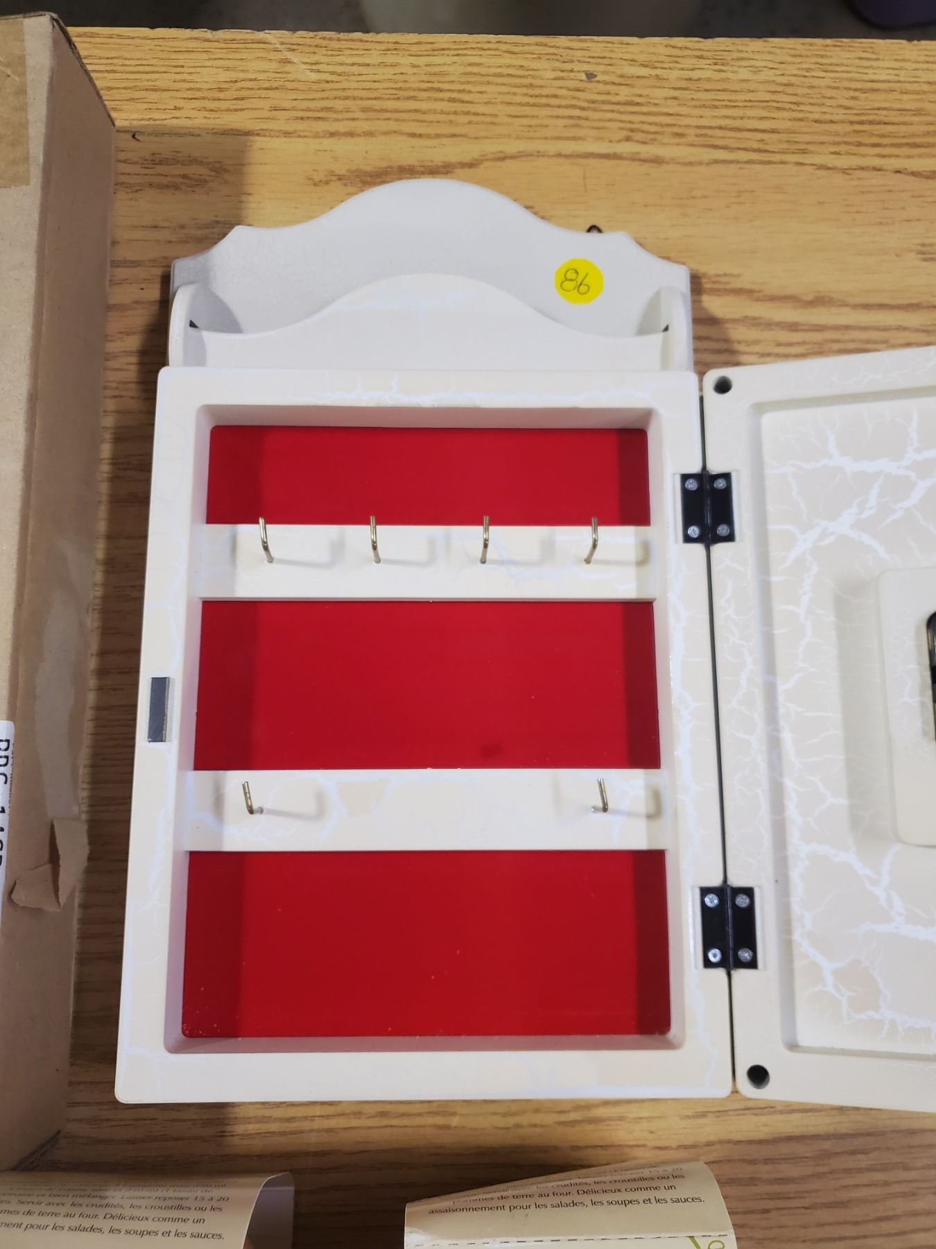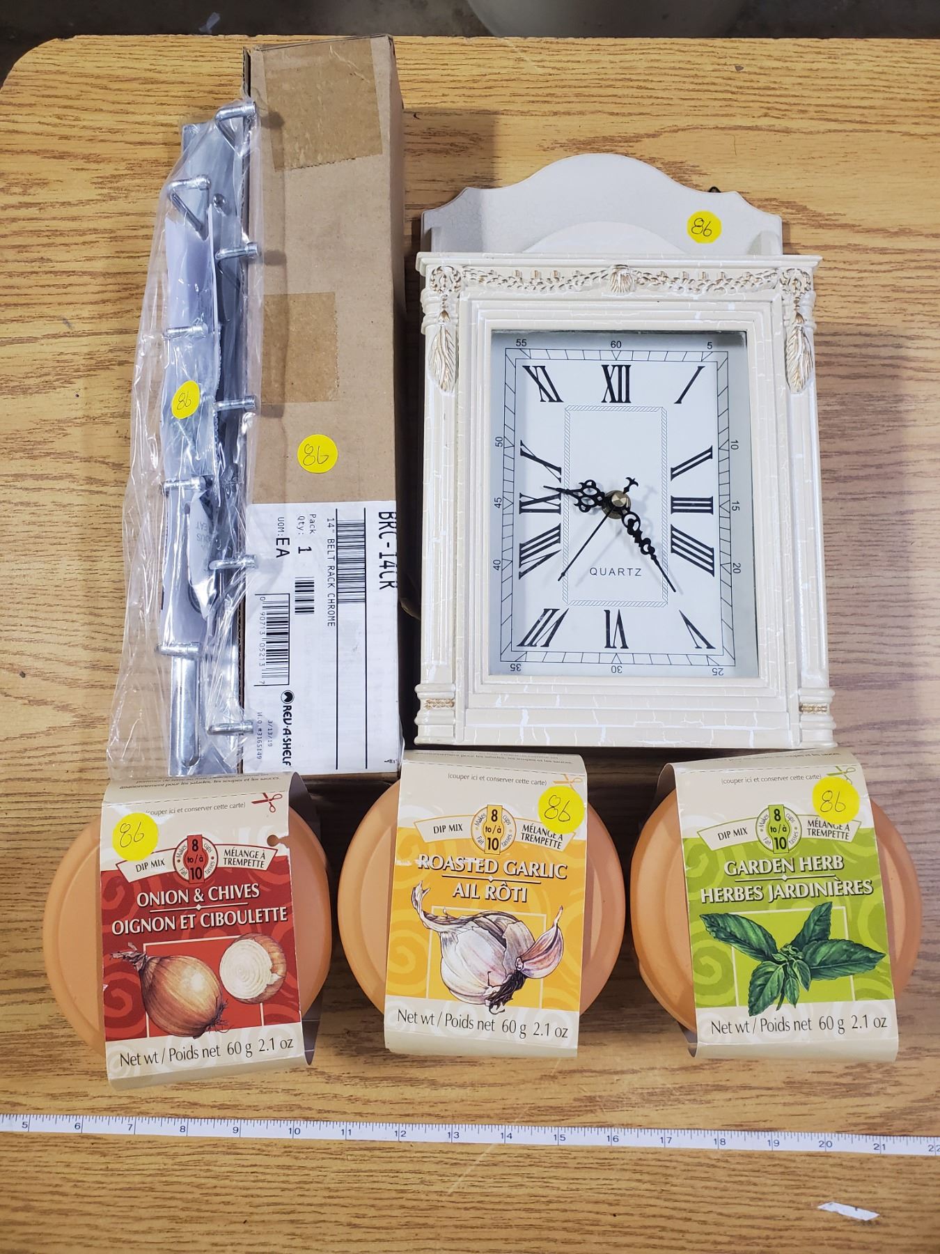 CLOCK WITH SMALL JEWELRY HOOKS INSIDE, BELT RACKS (2) & 3 NEW HERB DIP MIXES
