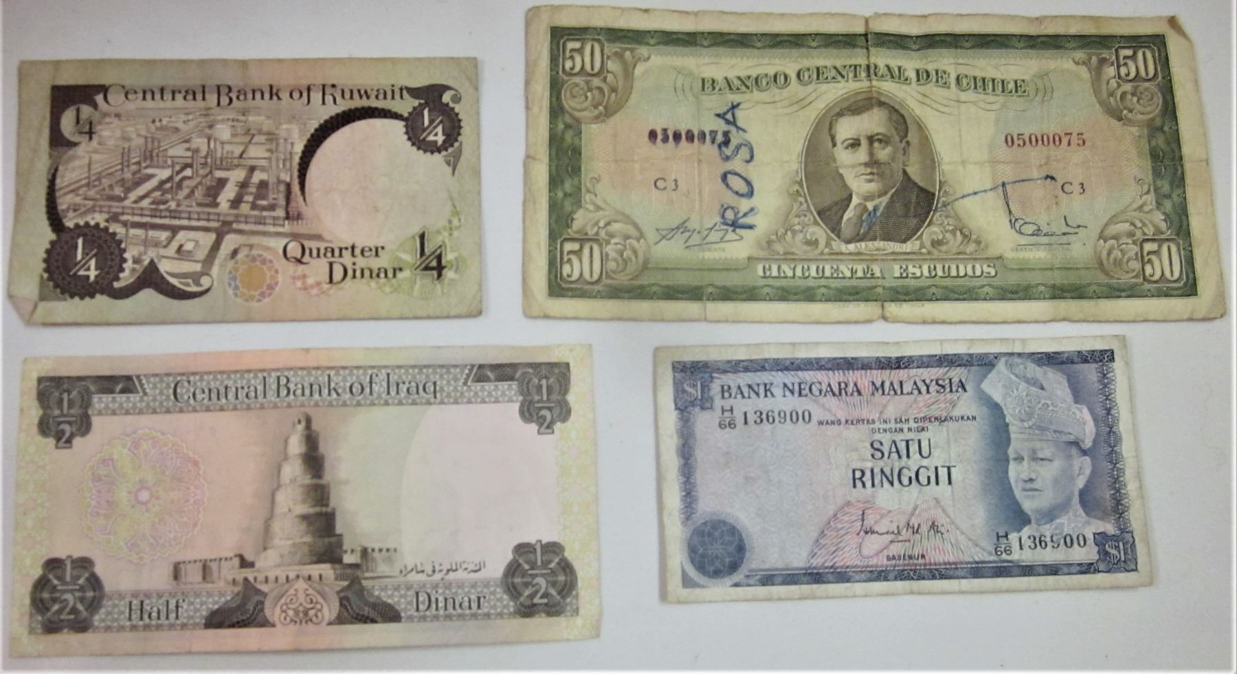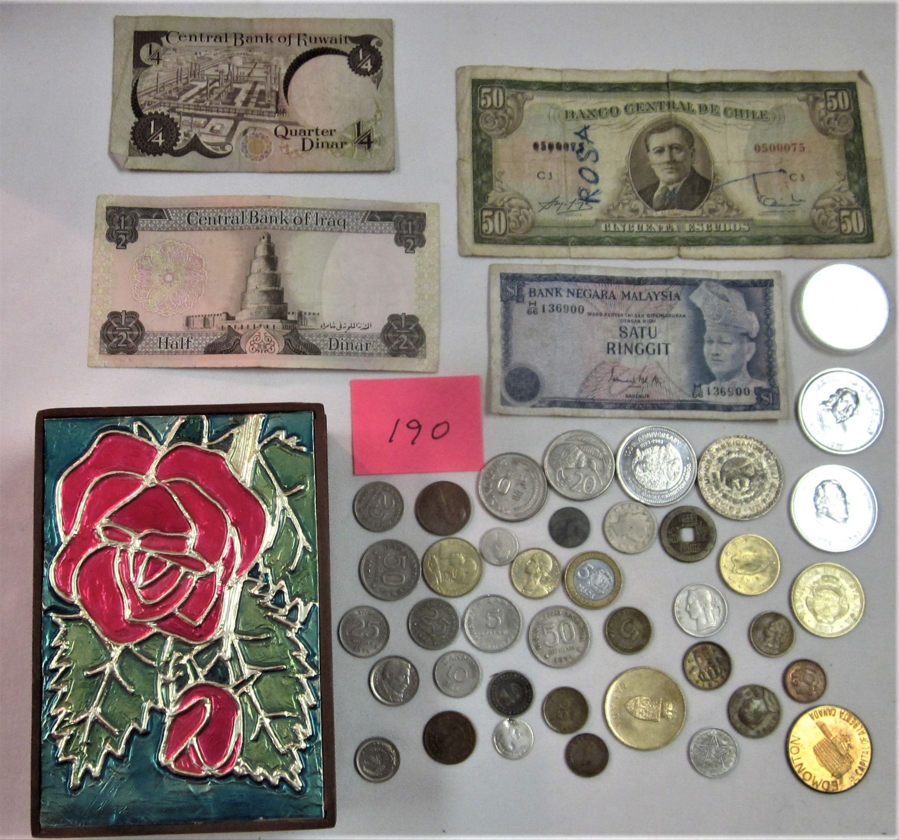 40 COINS-4 BILLS-CHILE, KUWAIT, IRAQ, MILAYSIA-VINATGE BOX INDONESIA