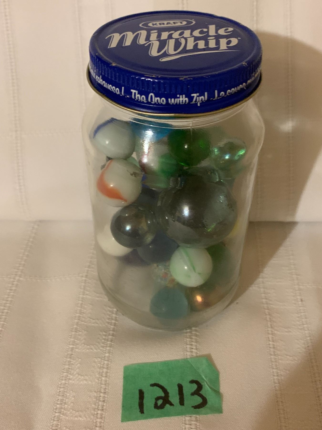 COLLECTOR MINIATURE MIRACLE WHIP JAR WITH GLASS VINTAGE MARBLES