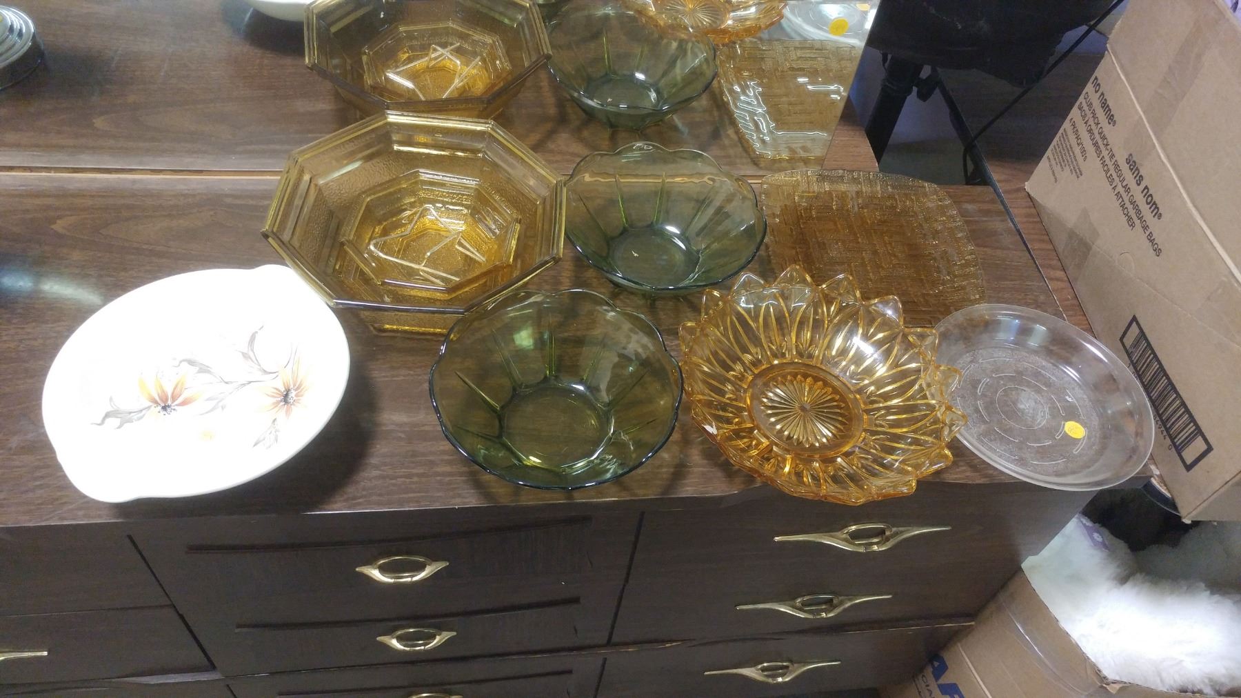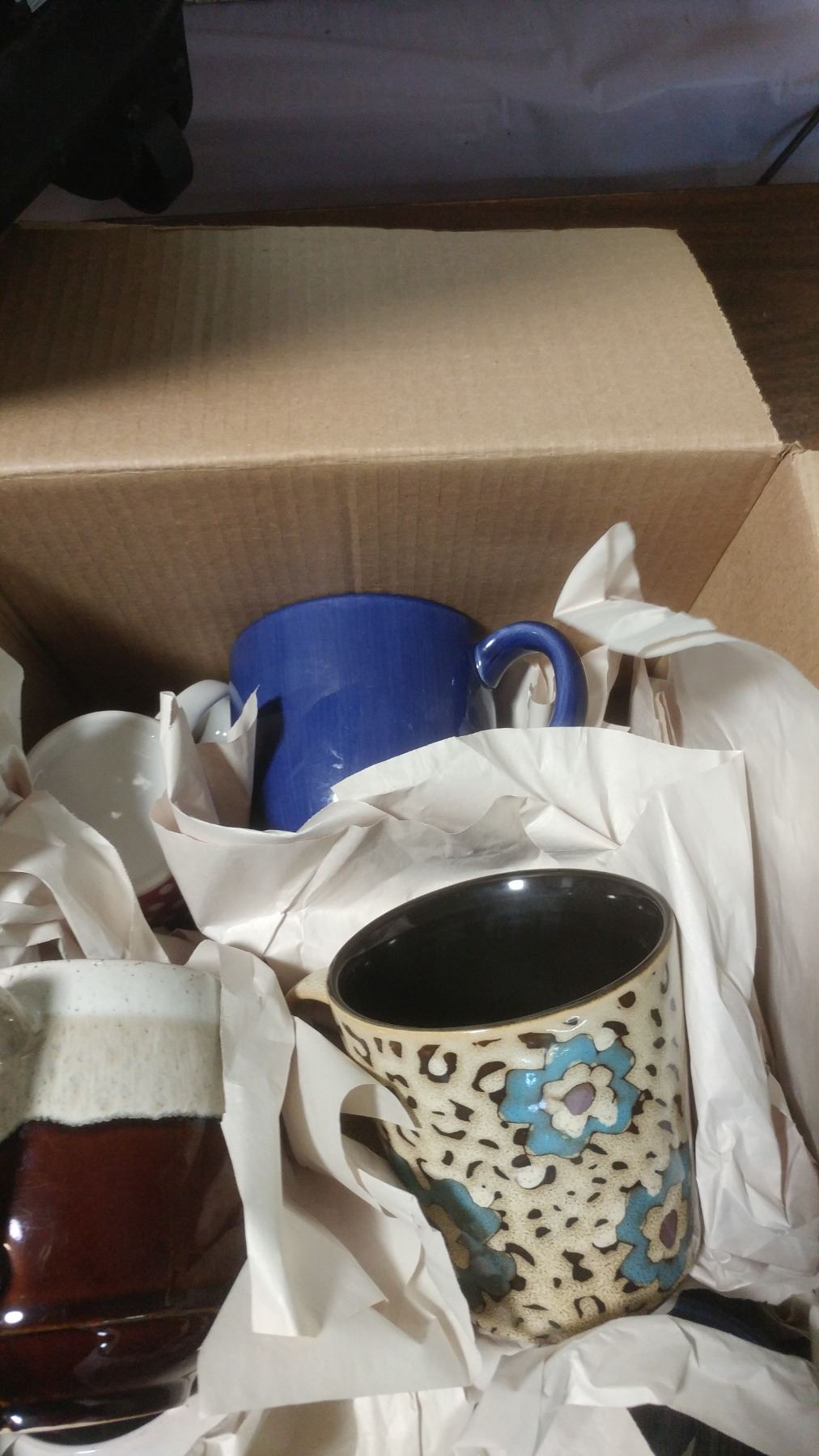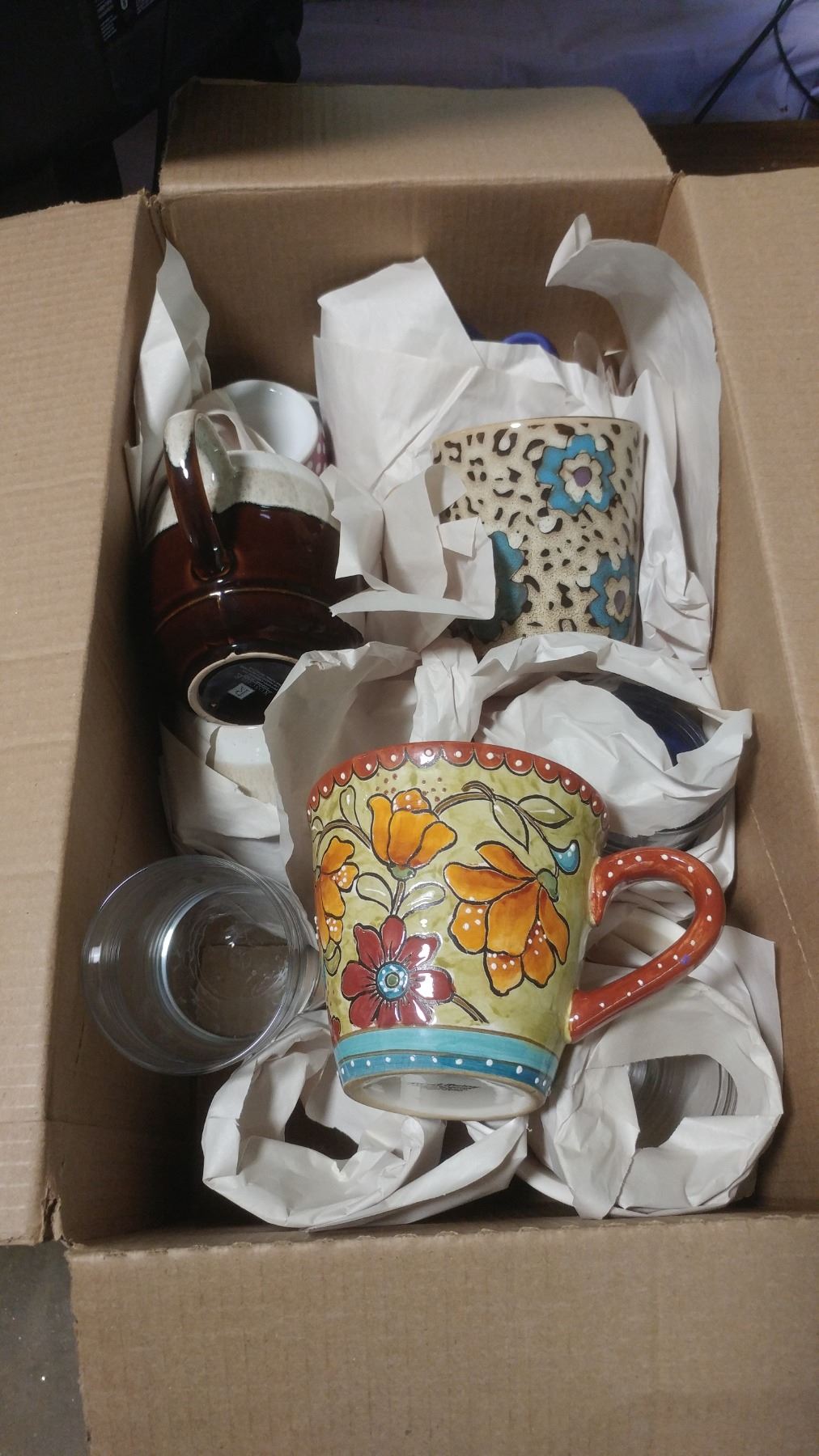 COLOURED GLASSWARE, BOX OF CUPS AND MUGS