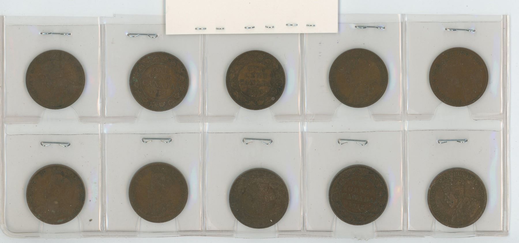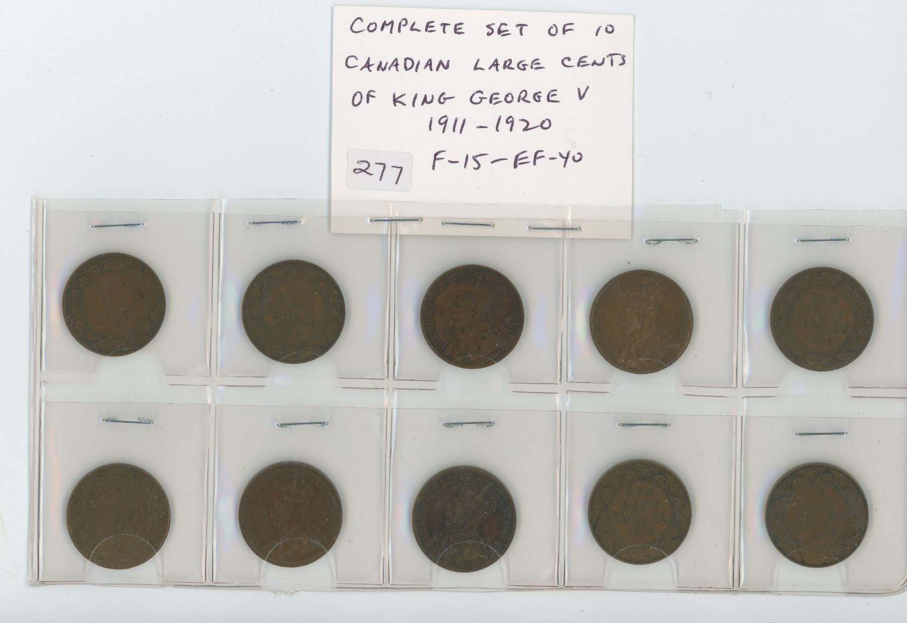 Complete set of 10 Canadian King George V Large Cents 1911-1920. Coins grade F-15 to EF-40