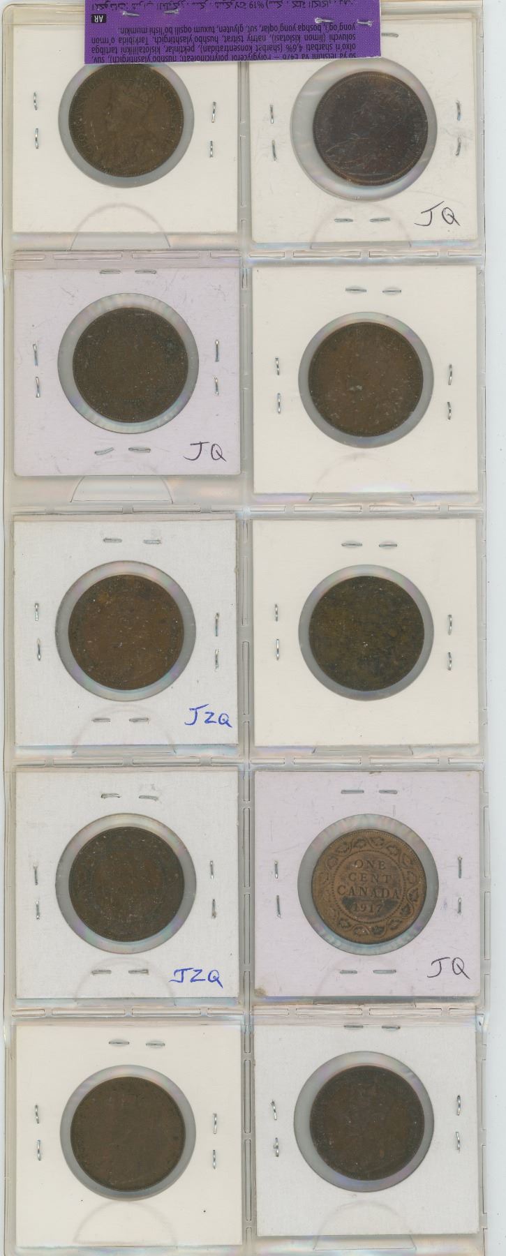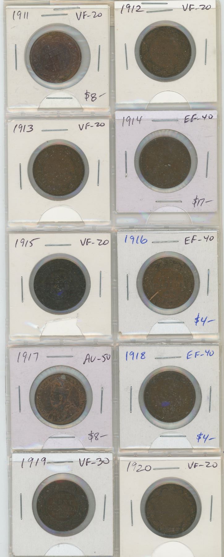 COMPLETE SET OF 10 GEORGE V LARGE CENTS 1911 – 1920. COINS GRADE VF-20 TO AU-50.