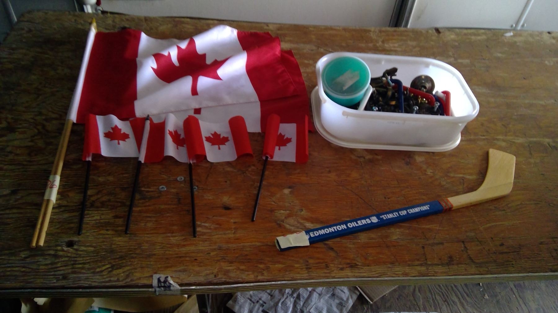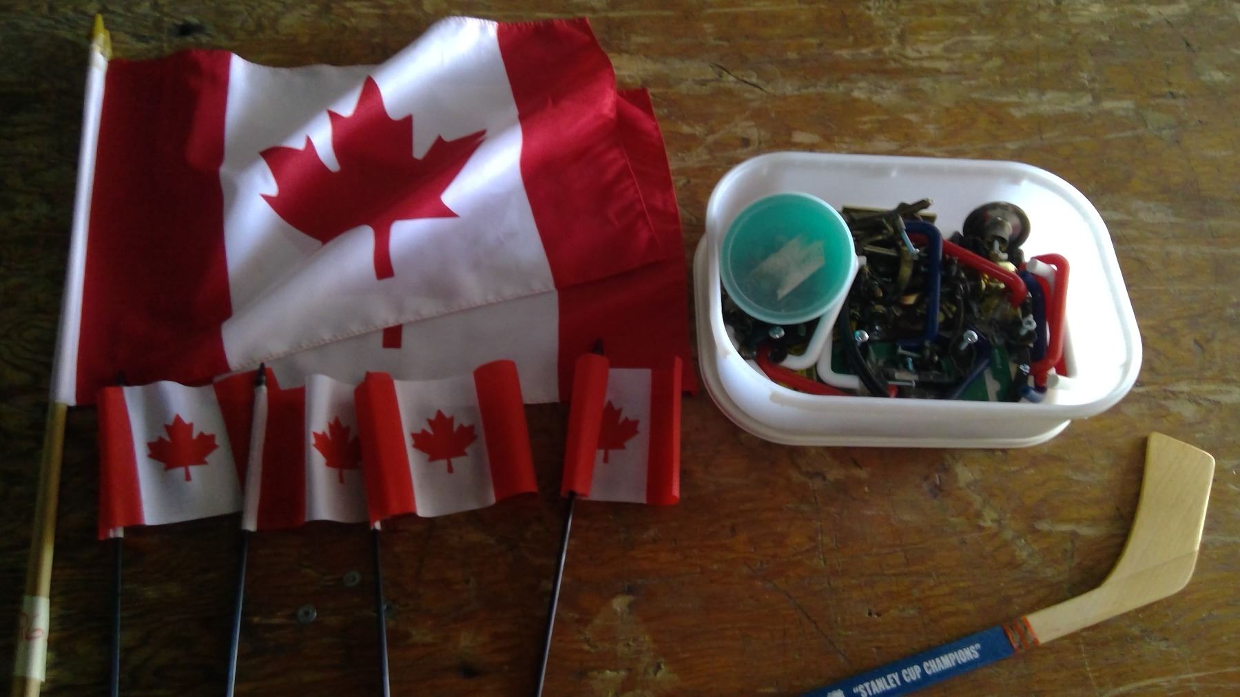 CONTAINER OF DOOR + DOOR/DRAW HANDLES AND NOBS + CANADA FLAGS