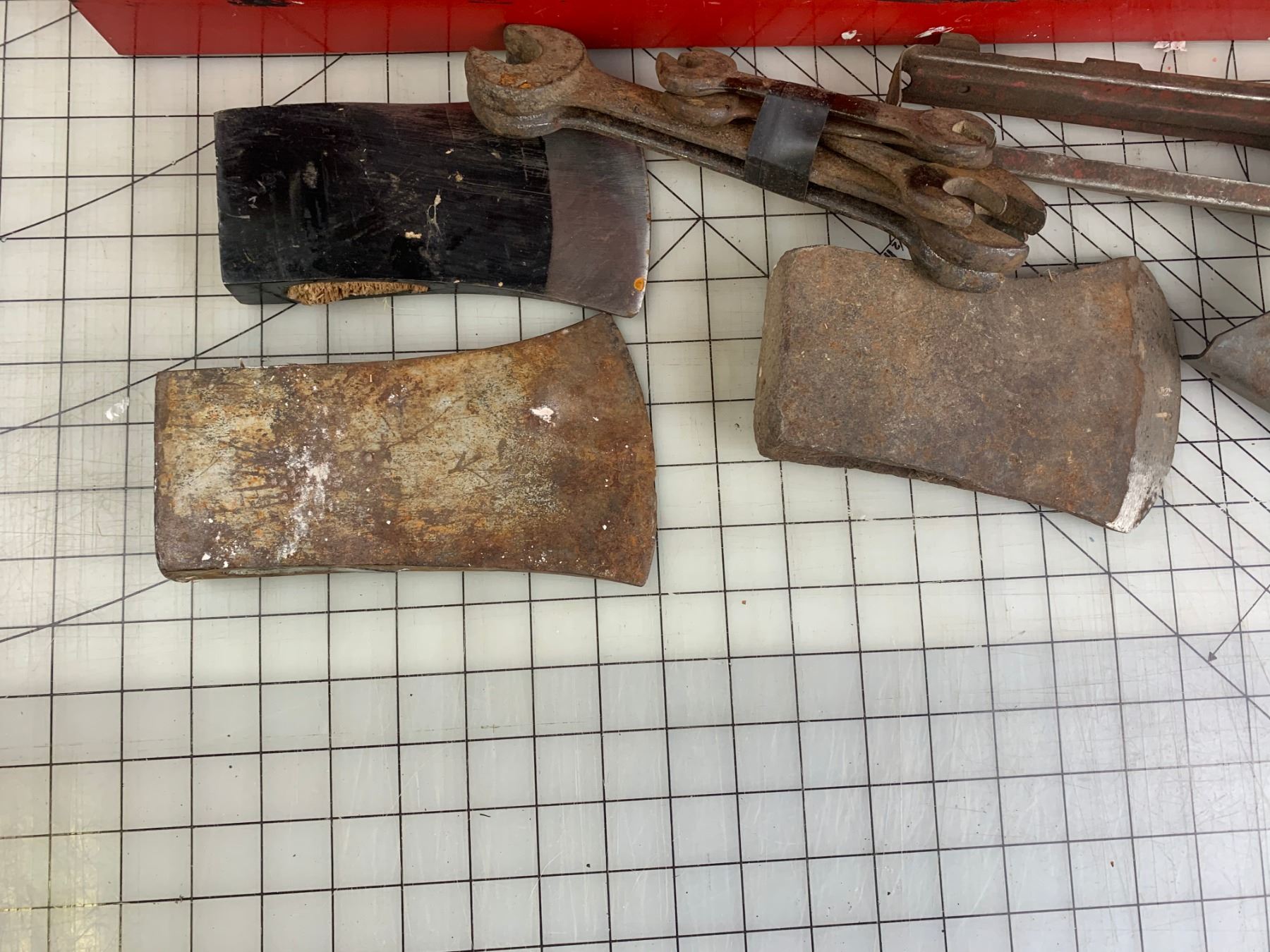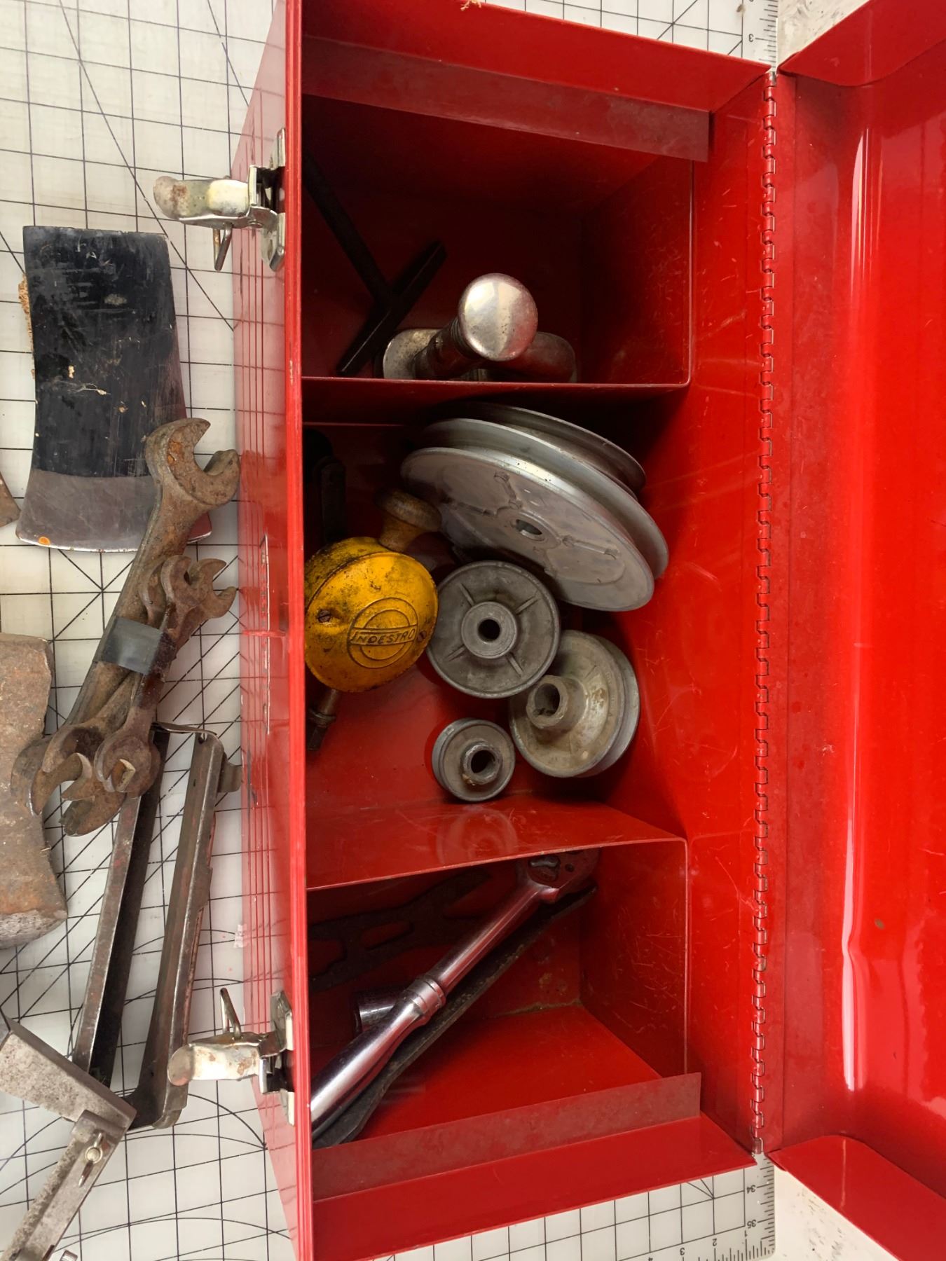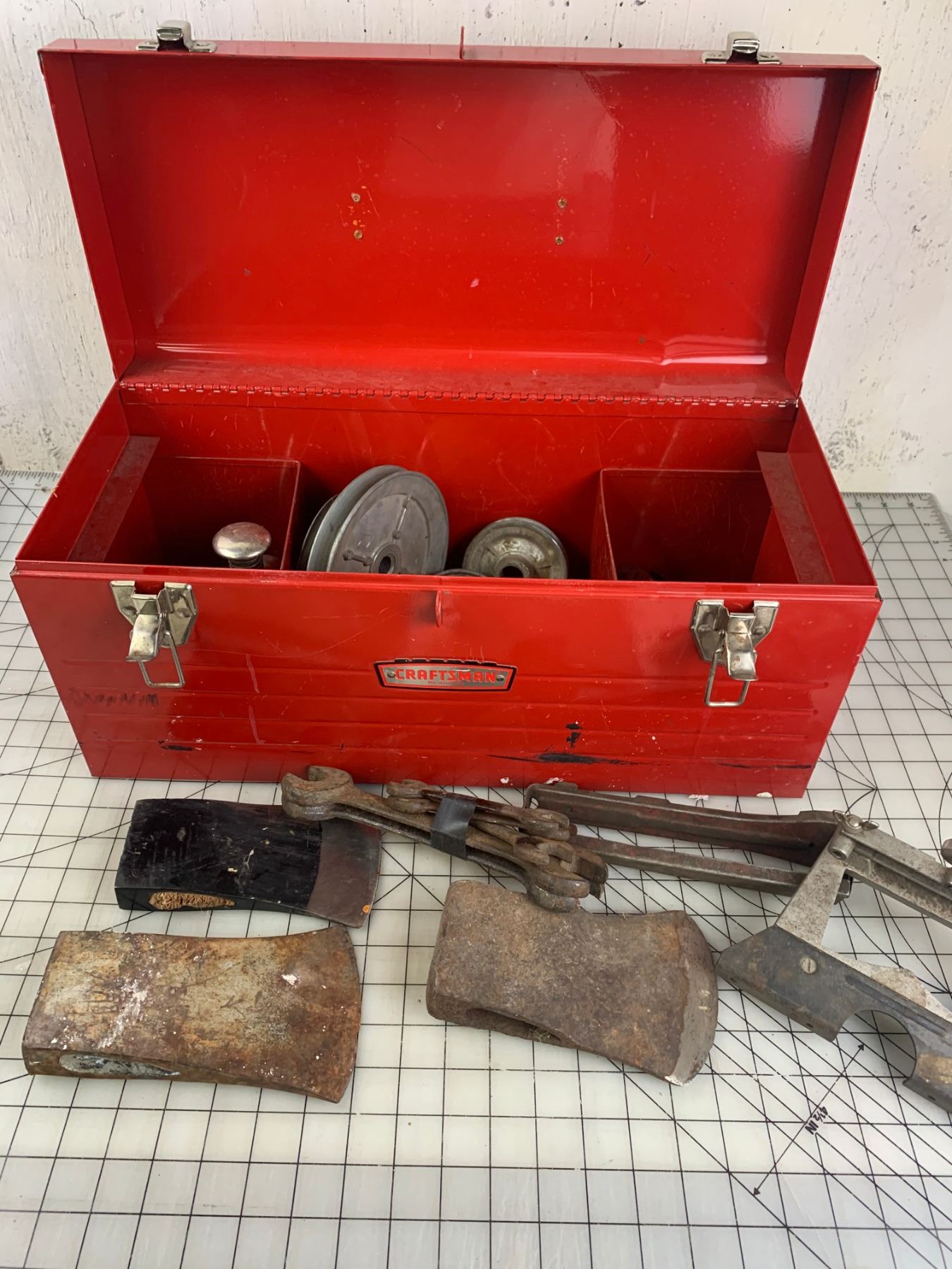 CRAFTSMAN METAL TOOL BOX WITH CONTENTS AXE HEADS ETC