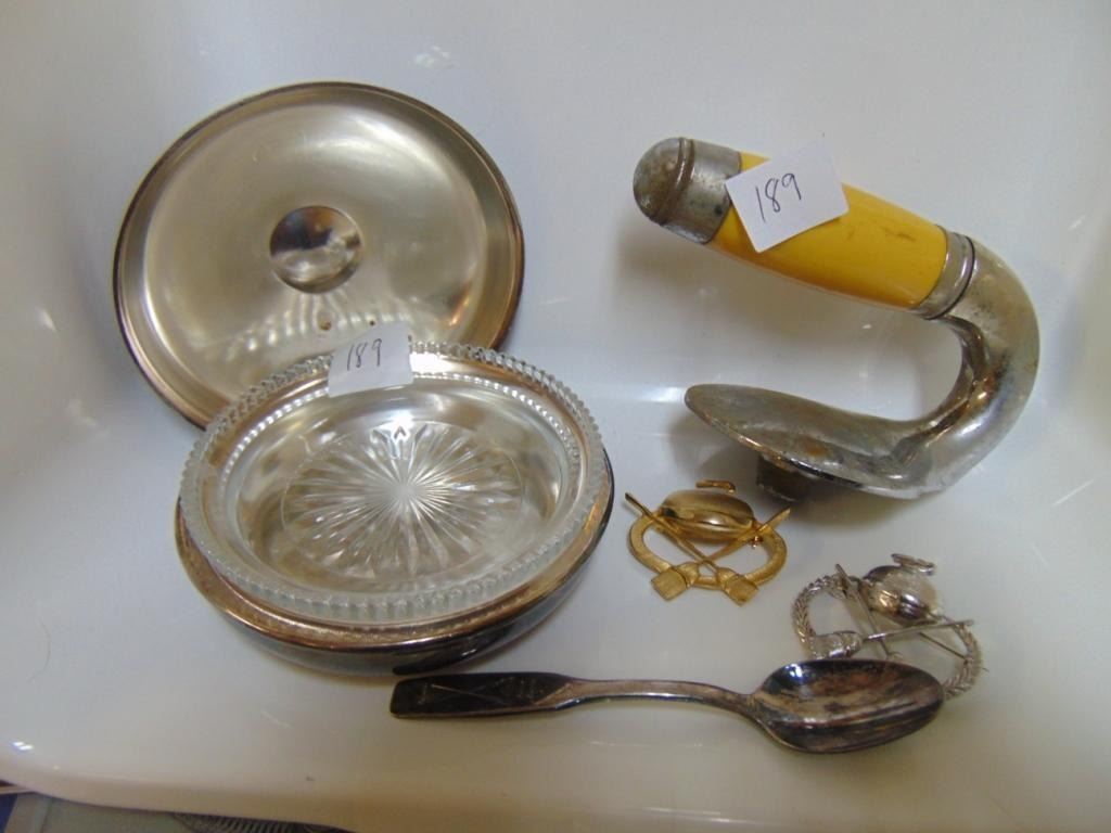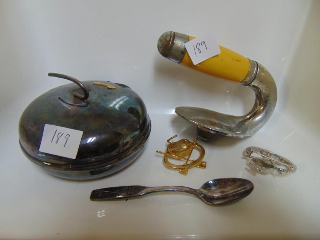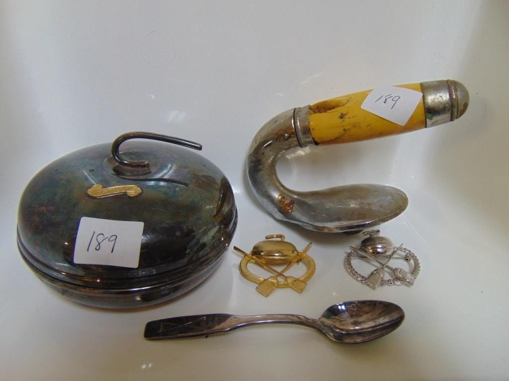 CURLING CANDY DISH, PINS, SPOON & CURLING ROCK HANDLE