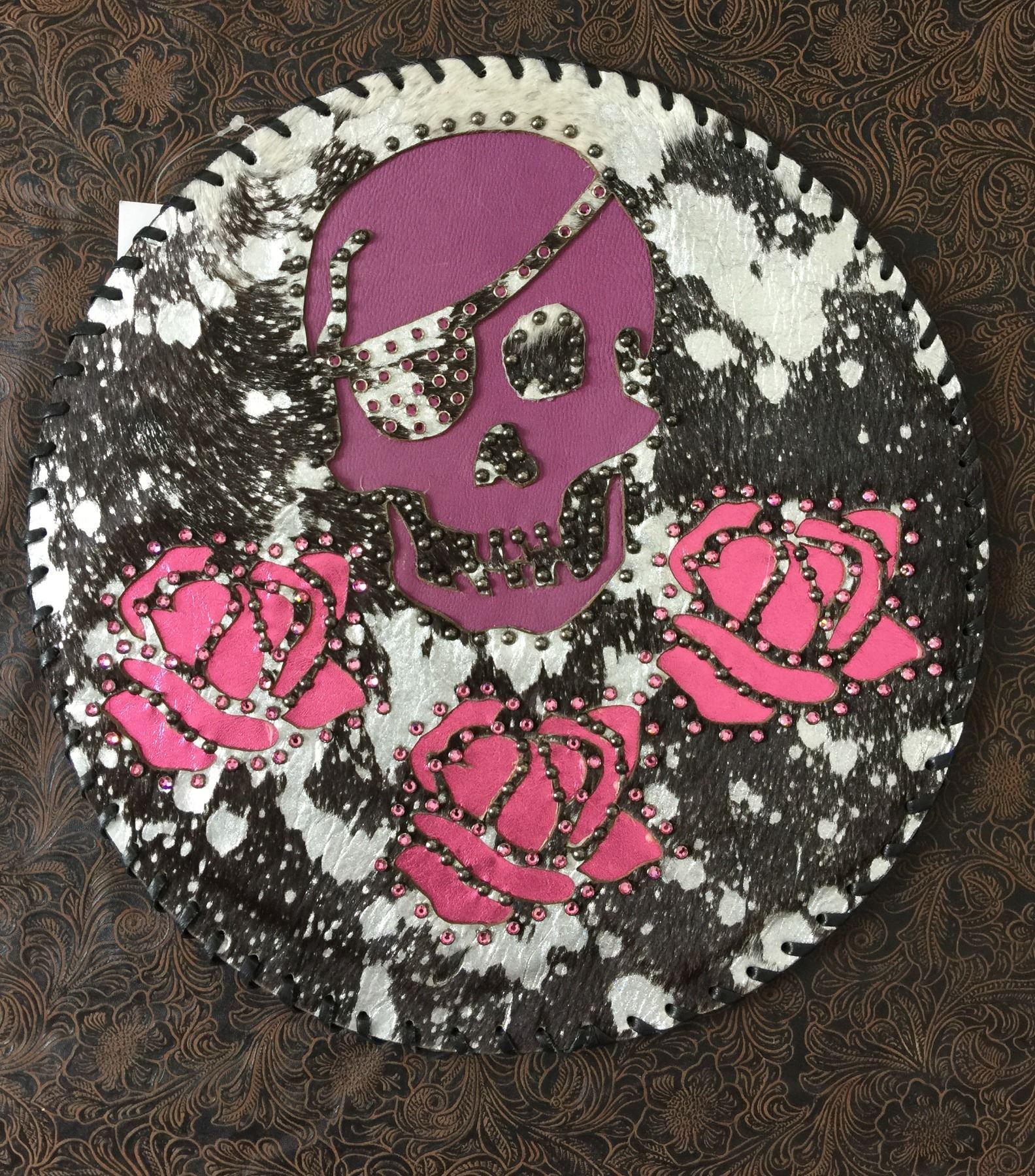 CUSTOM LEATHER ROPE CAN LID, SUGAR SKULL,THICK STURDY LEATHER, WOULD MAKE A GREAT WESTERN CLOCK!!!!