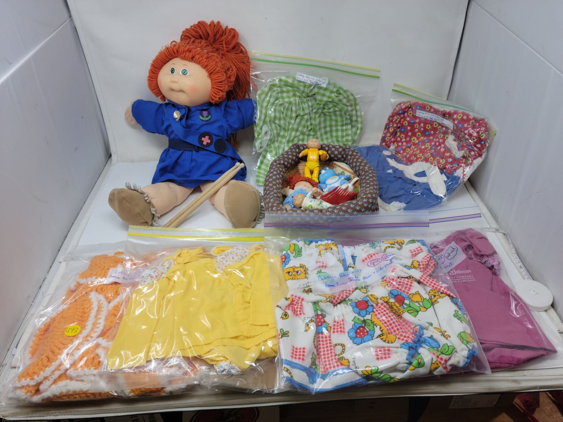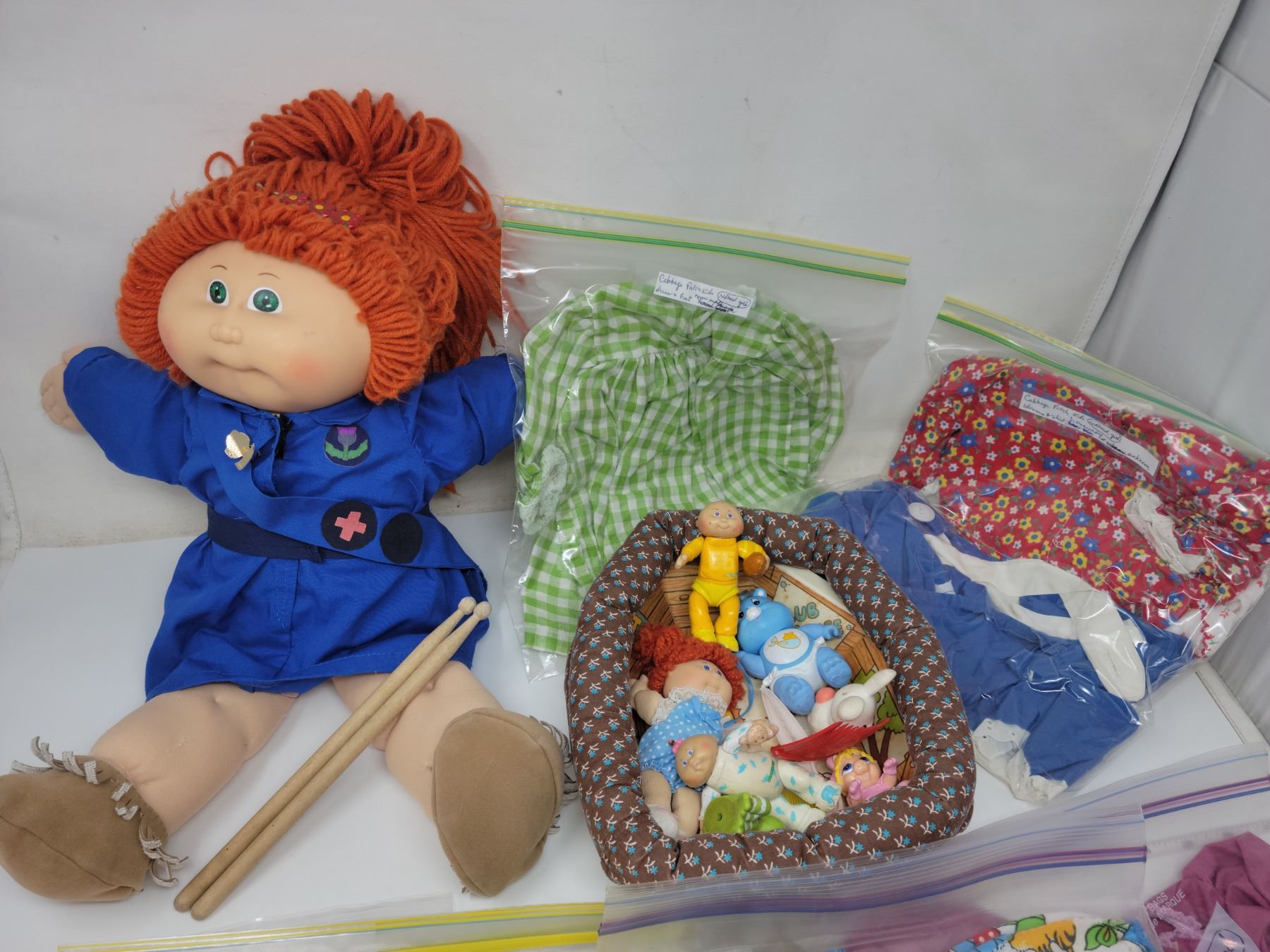 Extra clothes with authentic outfit. Pair of added drumsticks & cabbage patch tray of authentic characters & accessories, some unknown.