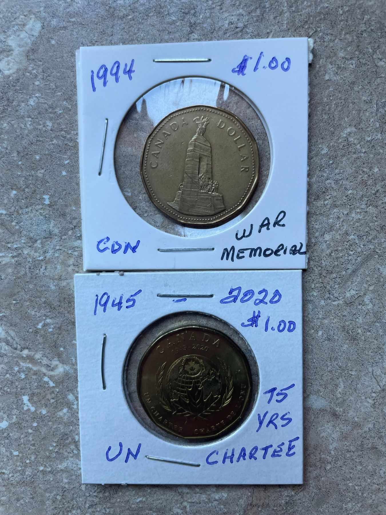 Canada $1 Dollar, 2 Coins, 1994 War Memorial, 1945-2020 Charter / Chartee 75 Years