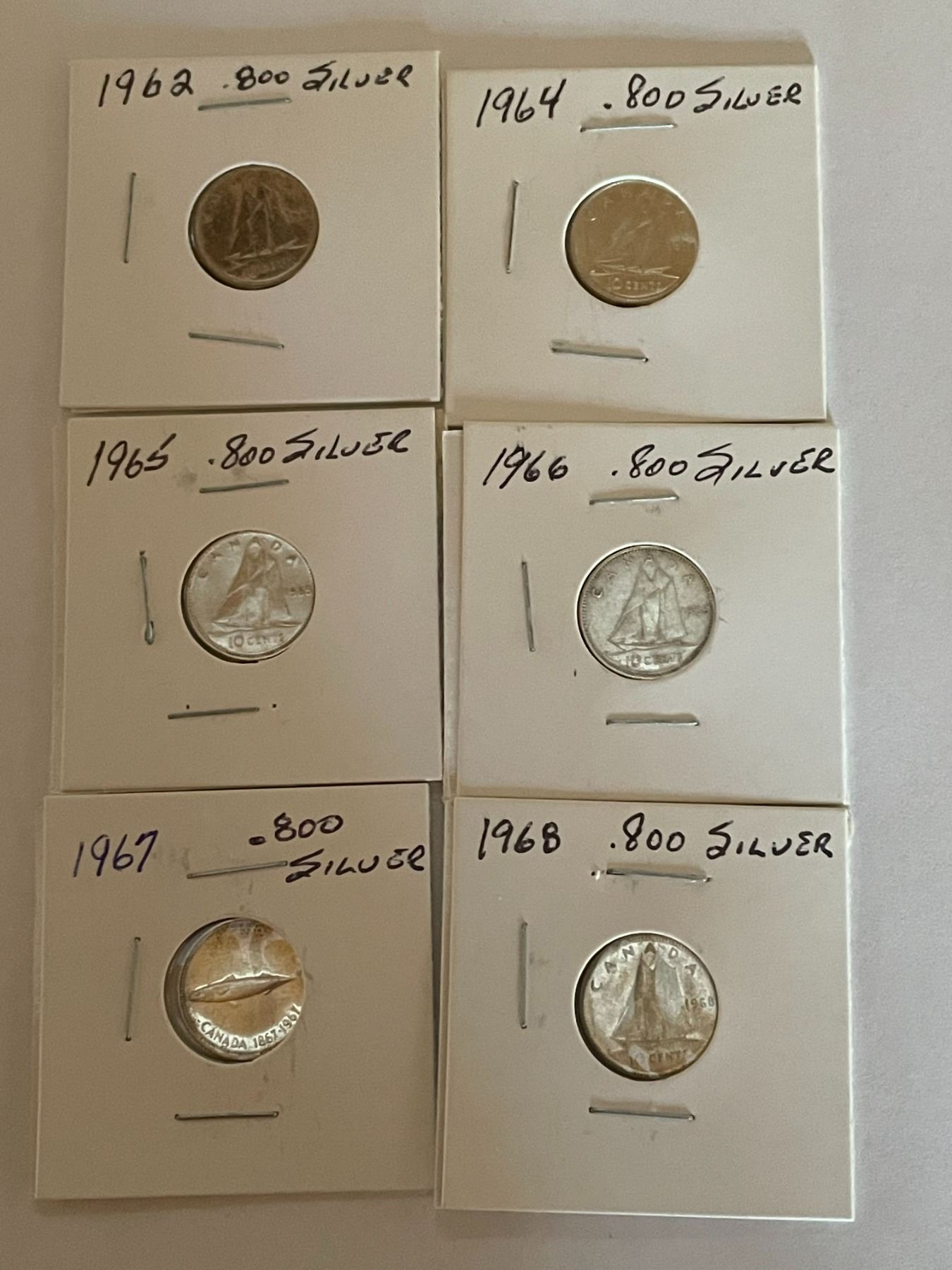 Canada 10 Cents Dime .800 Silver 6 Coins 1962, 1964, 1965, 1966, 1967, 1968