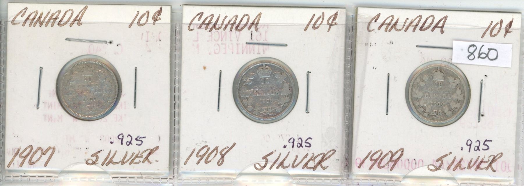 Canada 1907, 1908, 1909 Dimes Ft .925 Silver