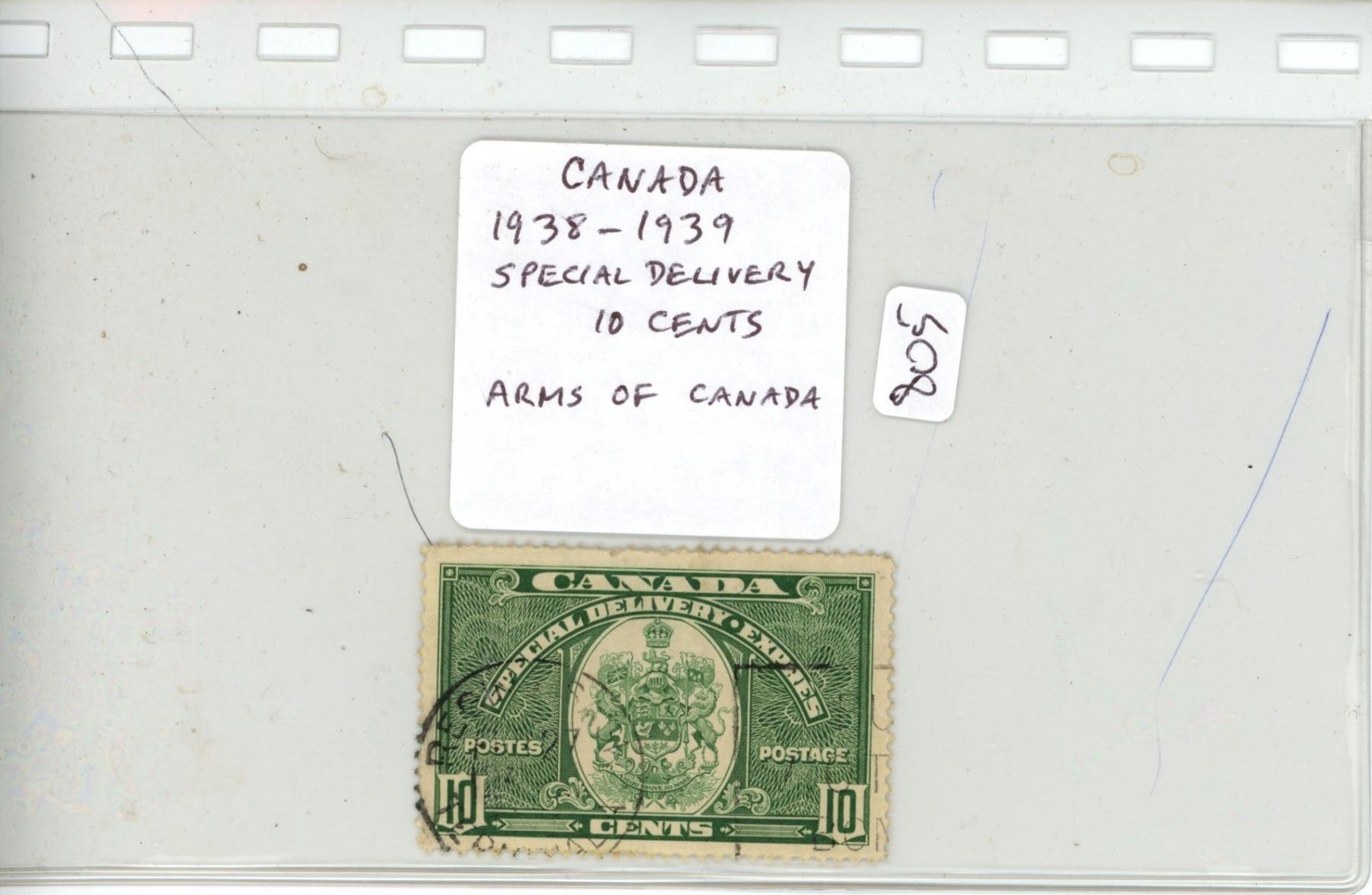 Canada 1938-1939 Special Delivery Stamp. Features Arms of Canada. Used.