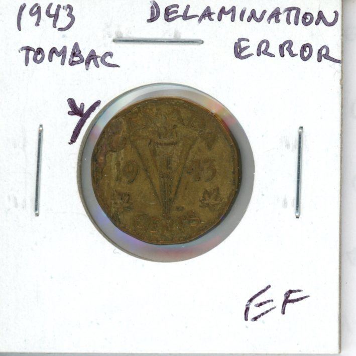 Canada 1943 Tombac 5 Cents Error. Coin has a major Delamination on the reverse to the left of 19 in date. EF with lustre.