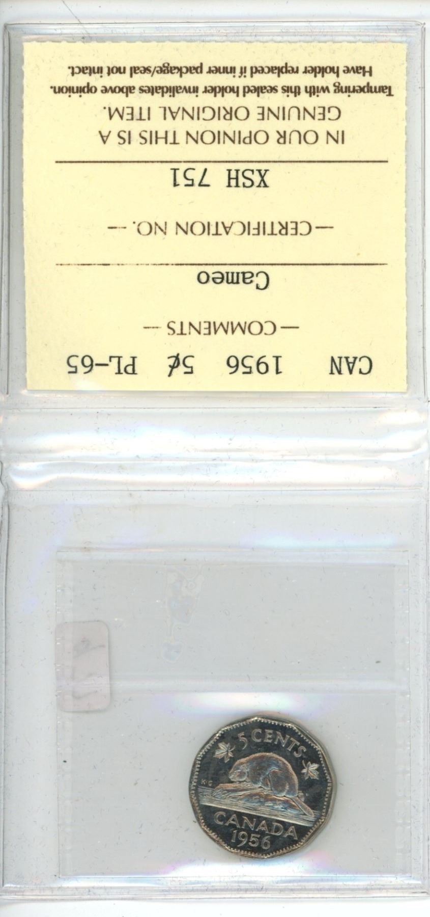 Canada. 1956 5 Cents. ICCS certified and graded PL-65 Cameo. A nice example.