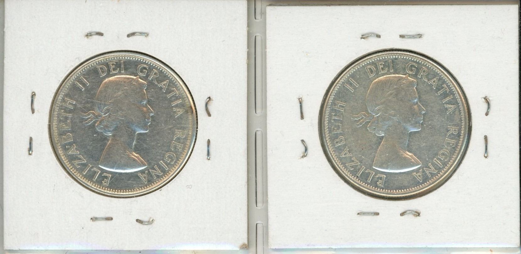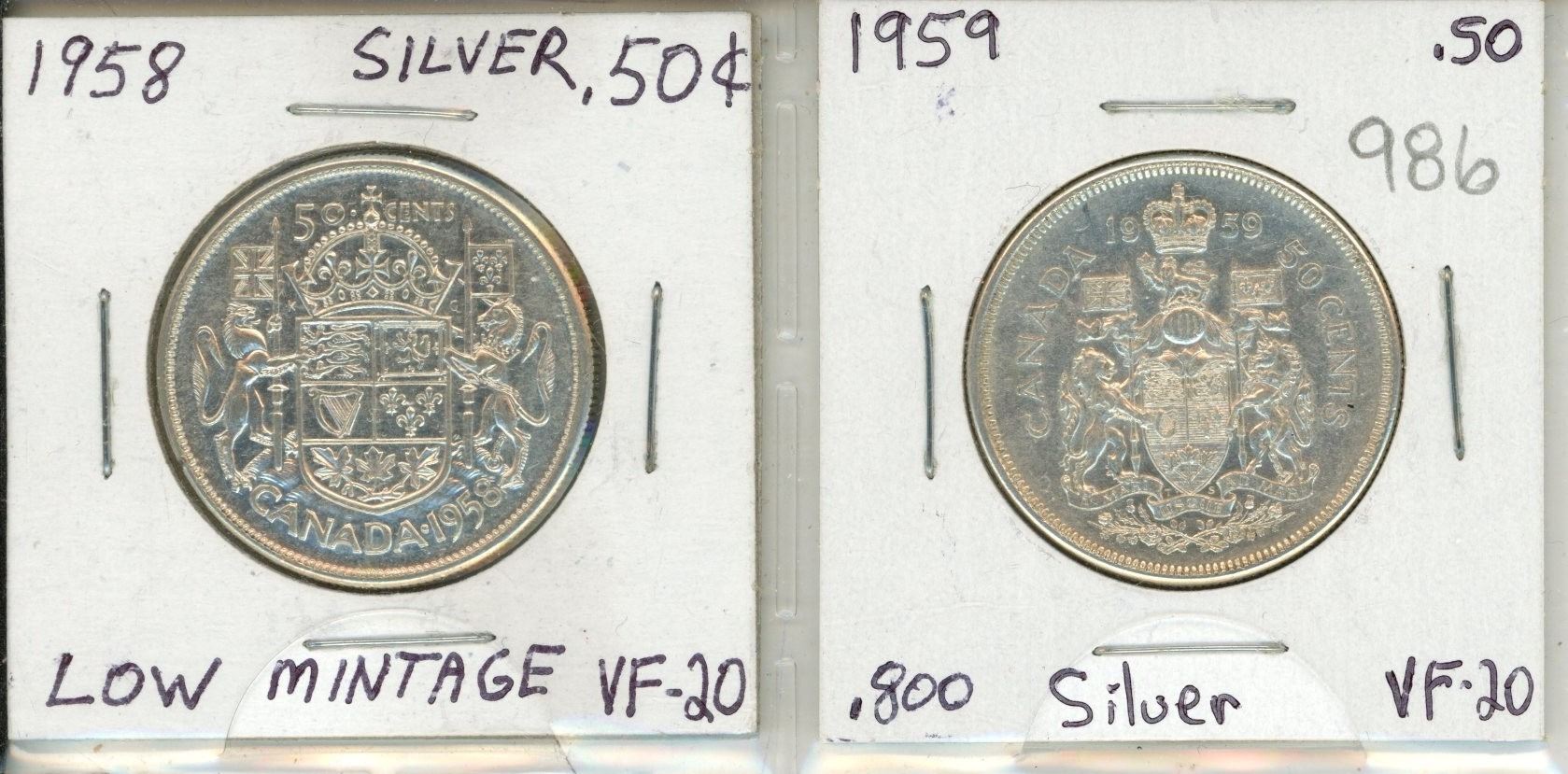 Canada 1958 and 1959 Half Dollars .800 Silver Vf-20.