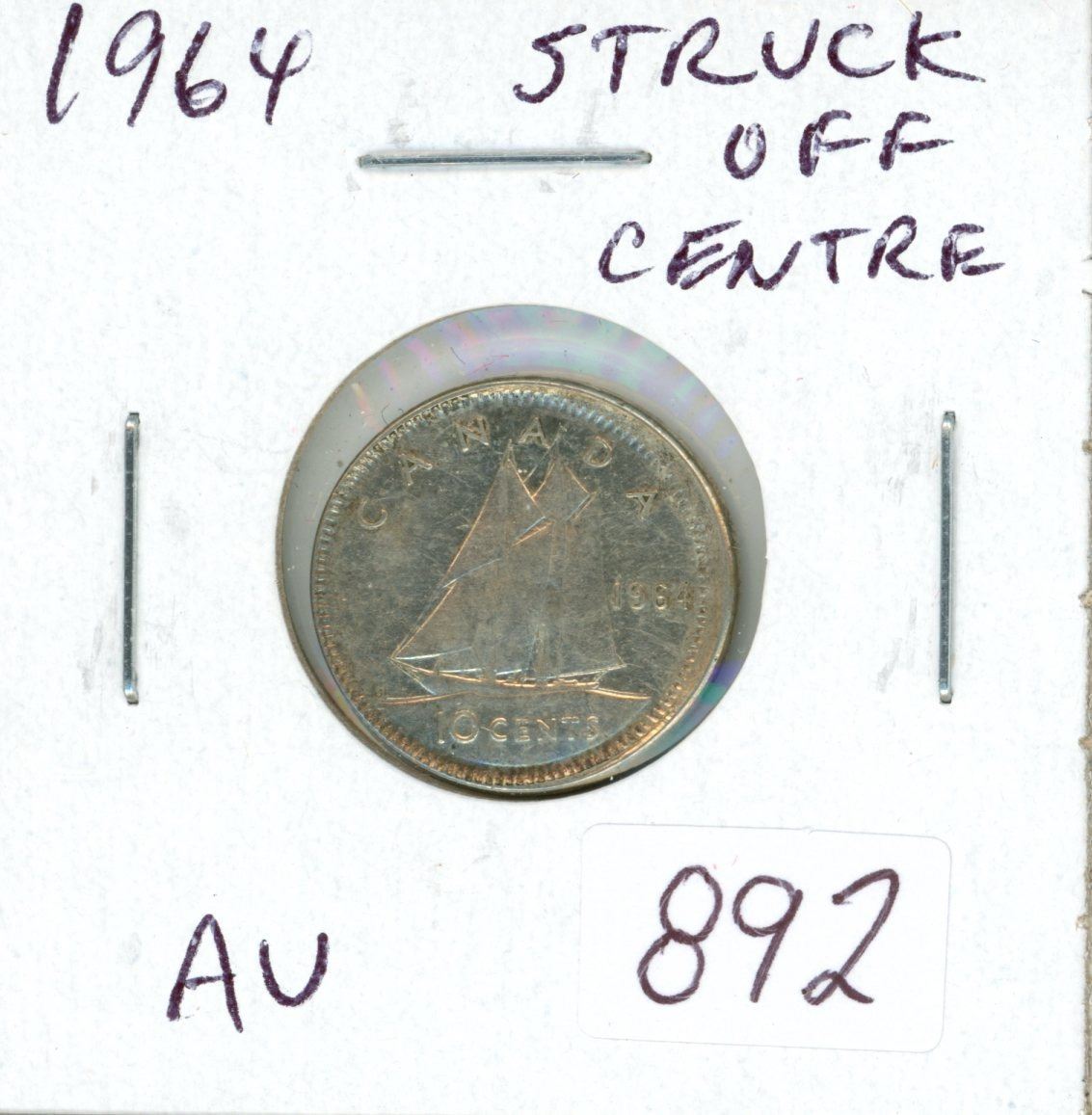 Canada. 1964 Off-Centre Struck Error Silver 10 Cents. AU.