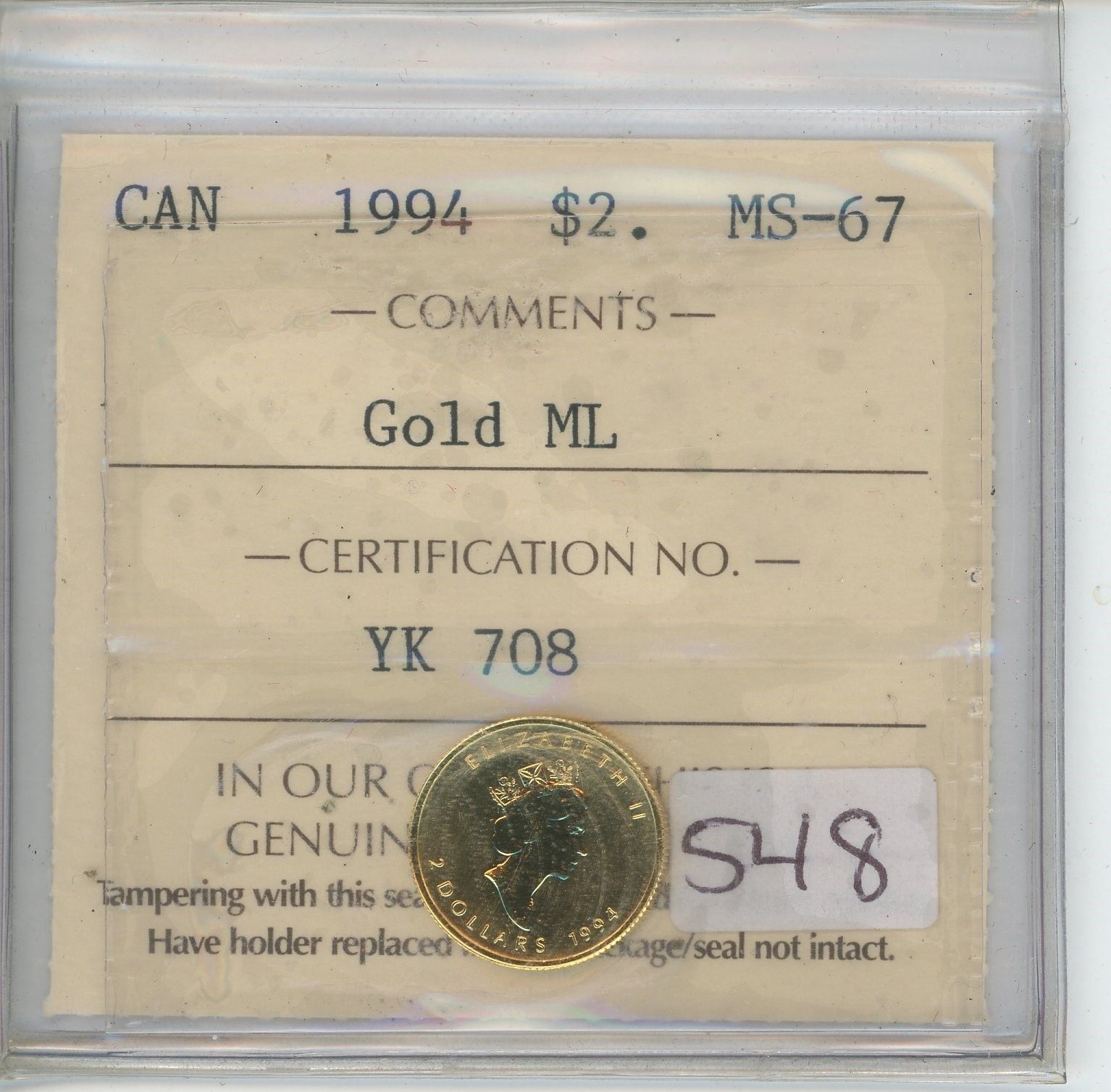 Canada 1994 $2 Gold Maple Leaf (ICCS certified as MS-67) https://www.cdncoin.com/product-p/99992115.htm $499.95 at Cadanian coin and currency,1-Gold coin The 1994 1/15th ounce pure gold Maple Leaf stands alone as a one year type that was discontinued immediately after issue. A must have for the collector of rare bullion denominations.