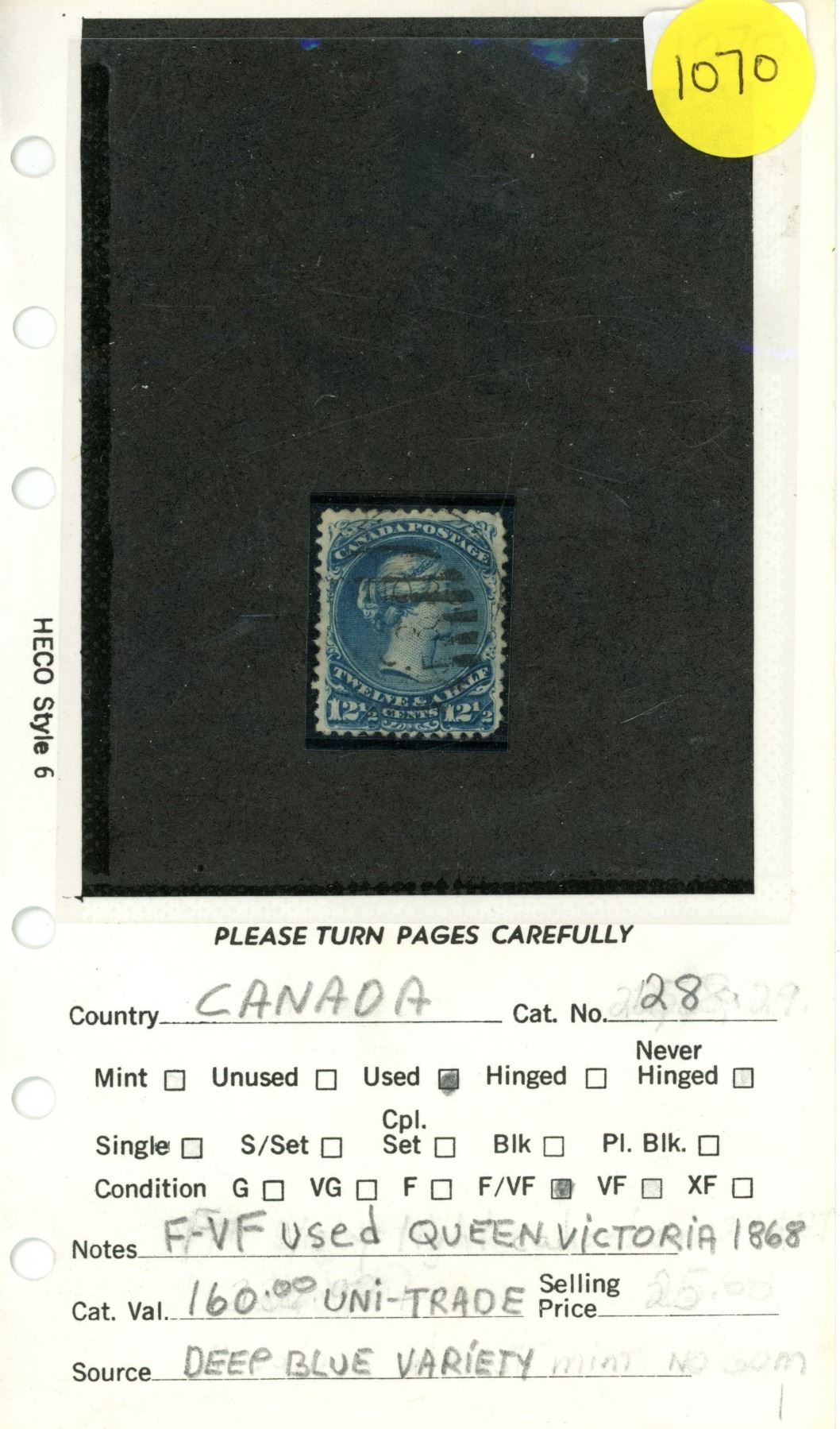 Canada 28 F-VF used Queen victoria 1868 yr. deep blue variety uni-trade Cat. 160.00