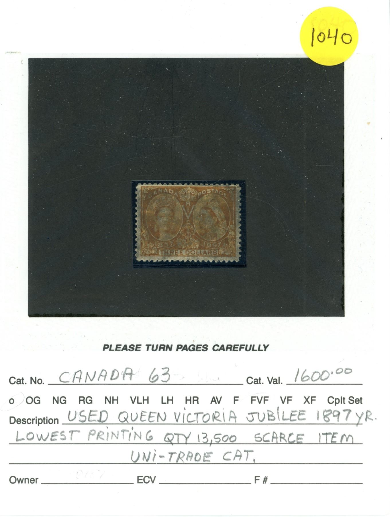 Canada 63 VF used queen victoria, lowest printing issue QTY. 13,500 scarce item 1897 yr. uni-trade Cat.16,00.00
