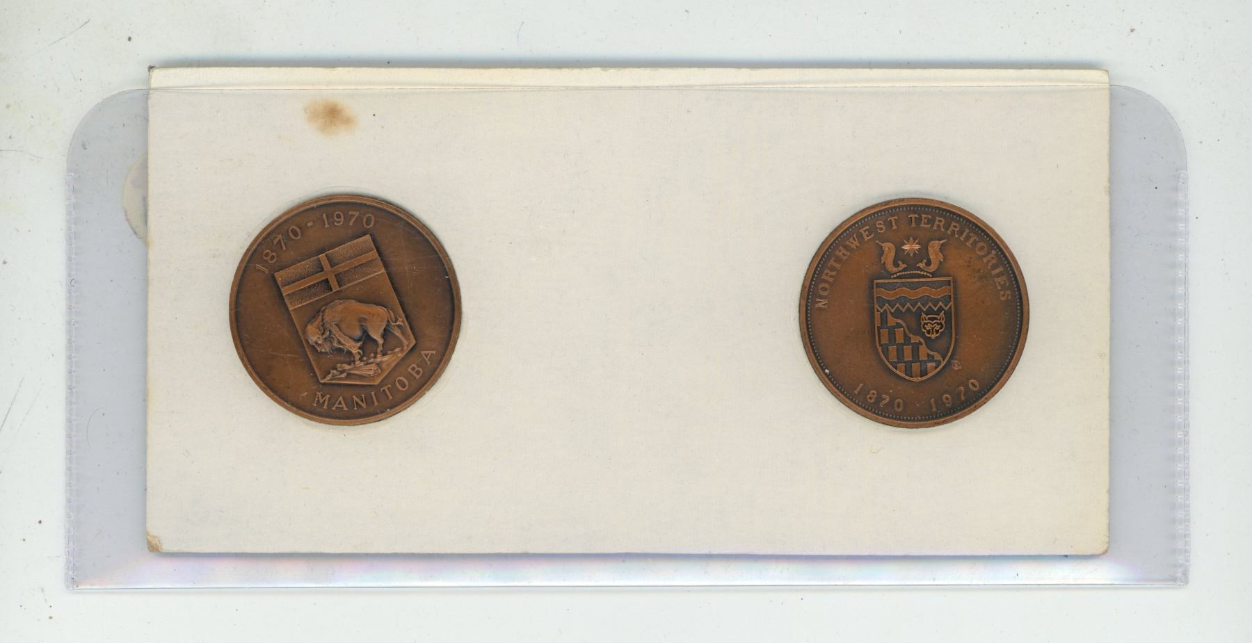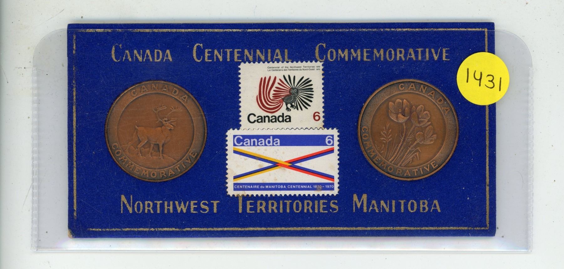 Canada Centennial Commemorative medal set for Northwest Territories and Manitoba. Includes 2 stamps.