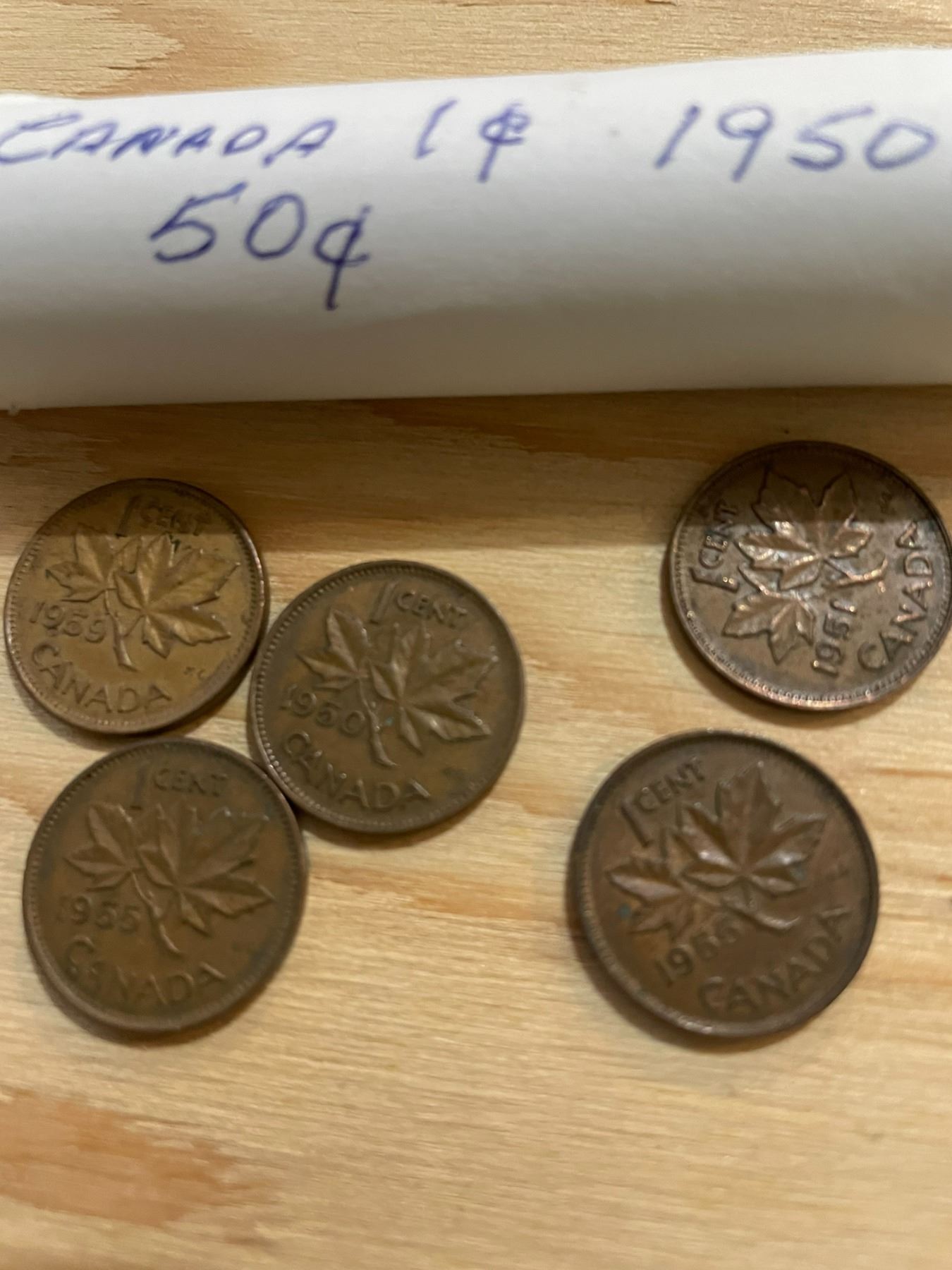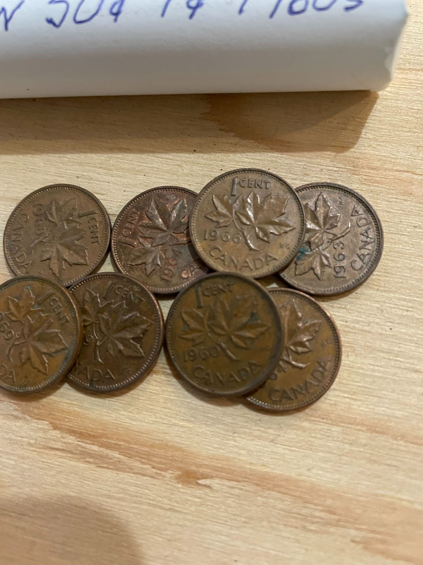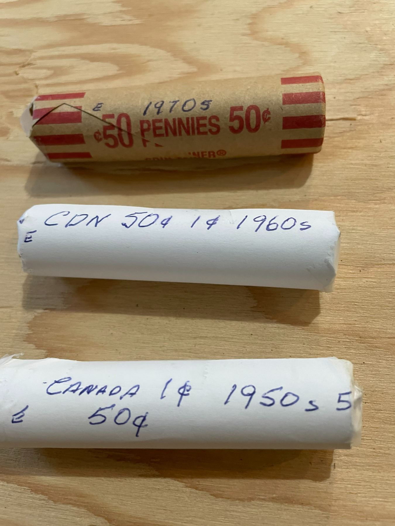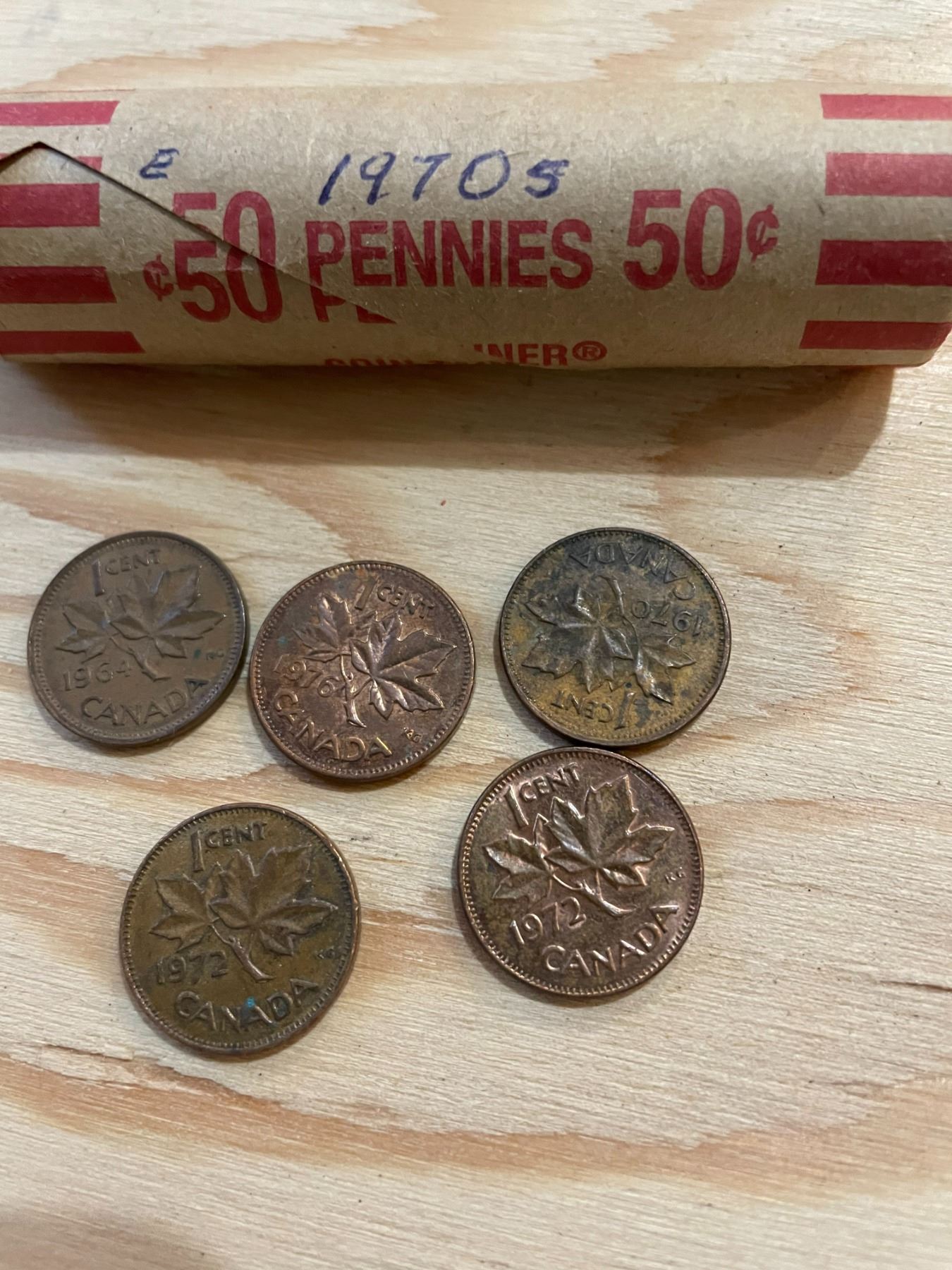 Canada Pennies 1 Cent Circulated, 3 Rolls - 1950s, 1960s, 1970s