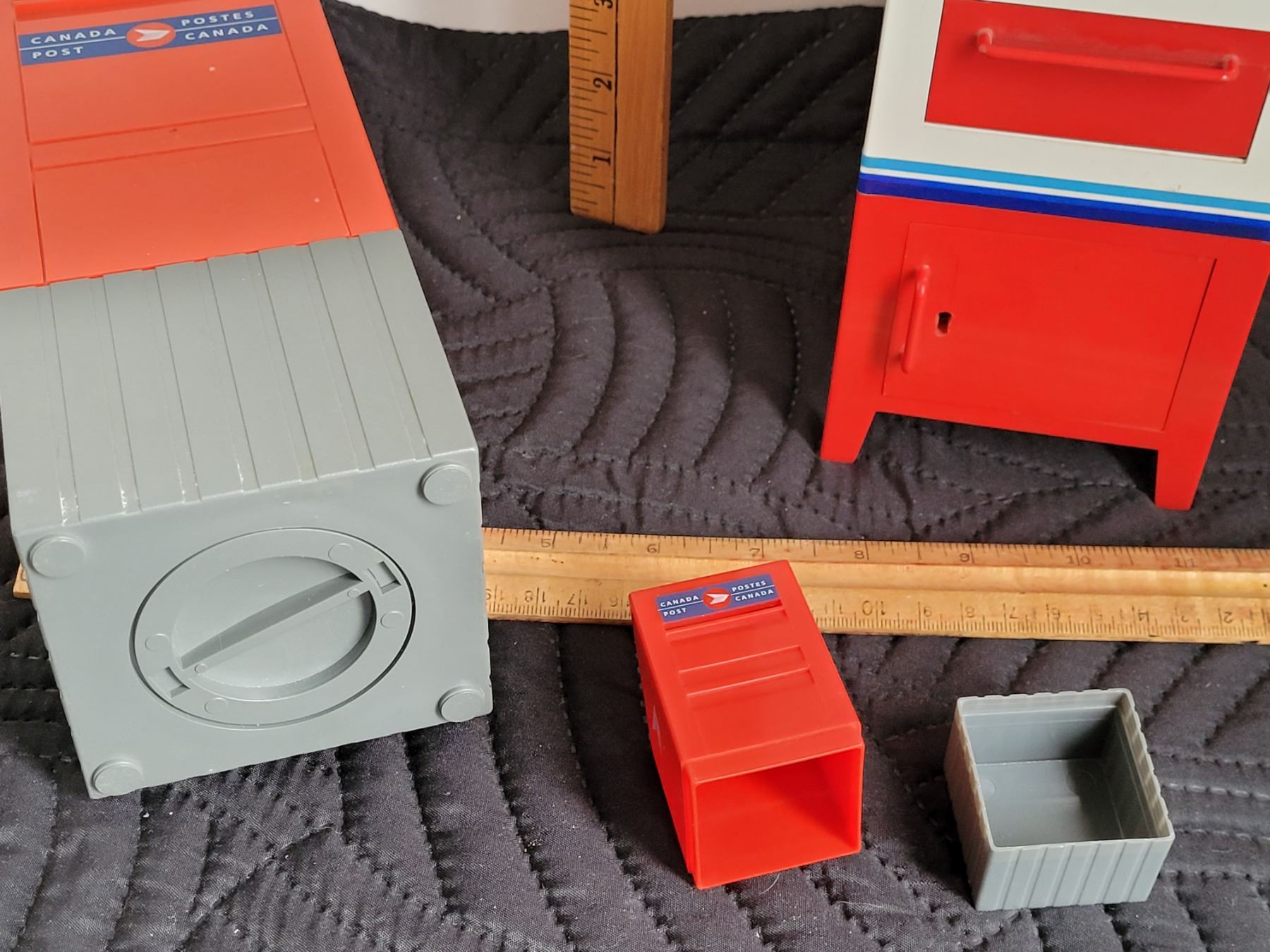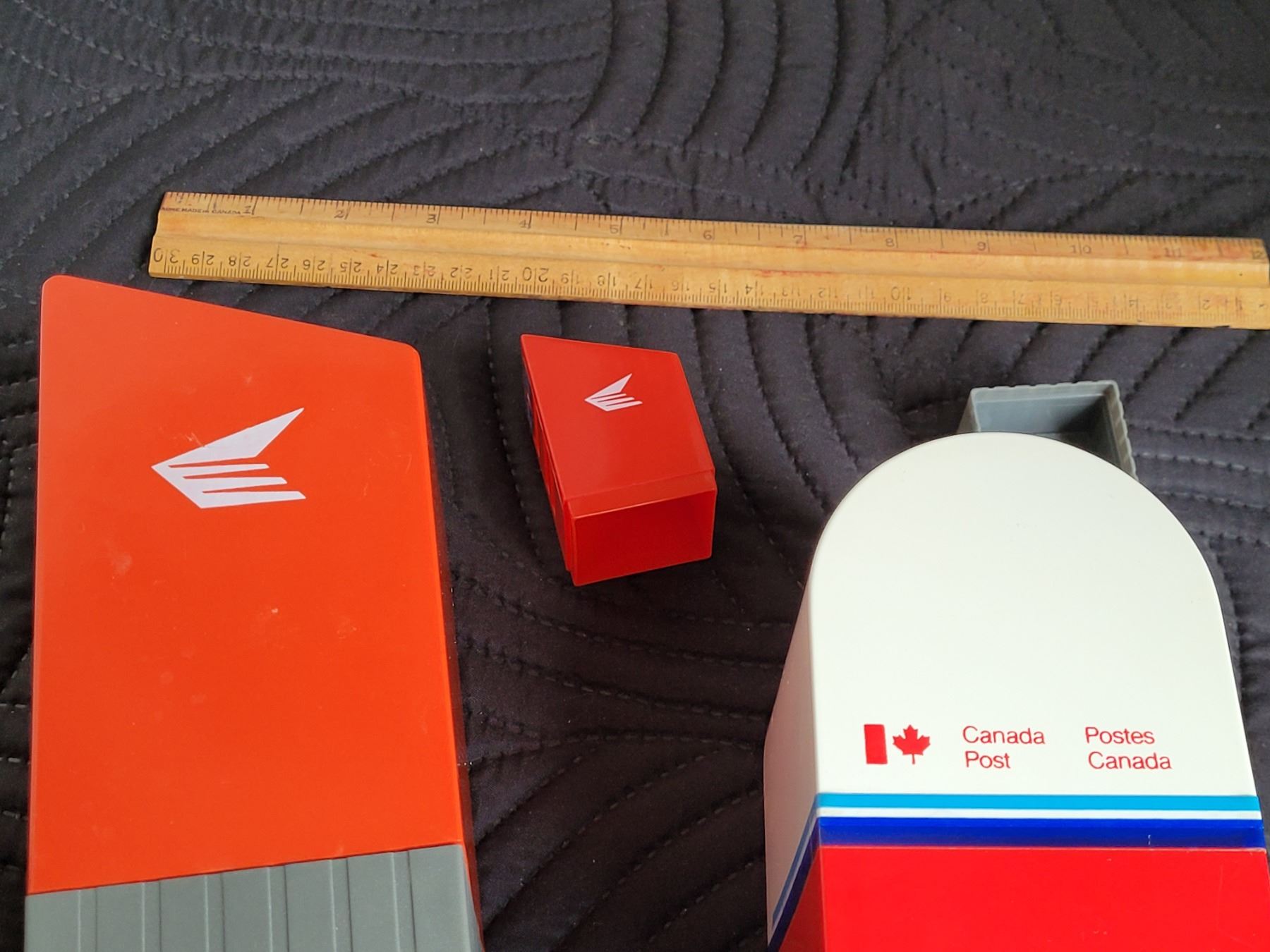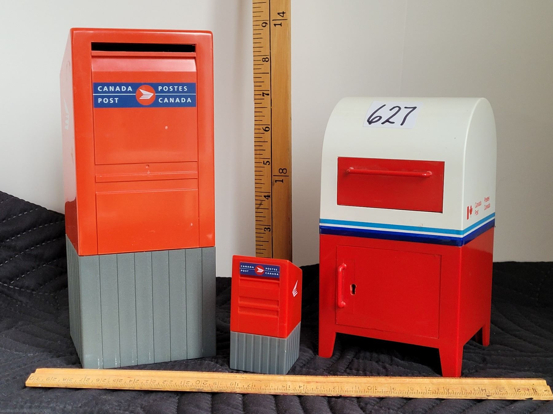 Canada Post replica mailbox banks and a stamp roll dispenser.