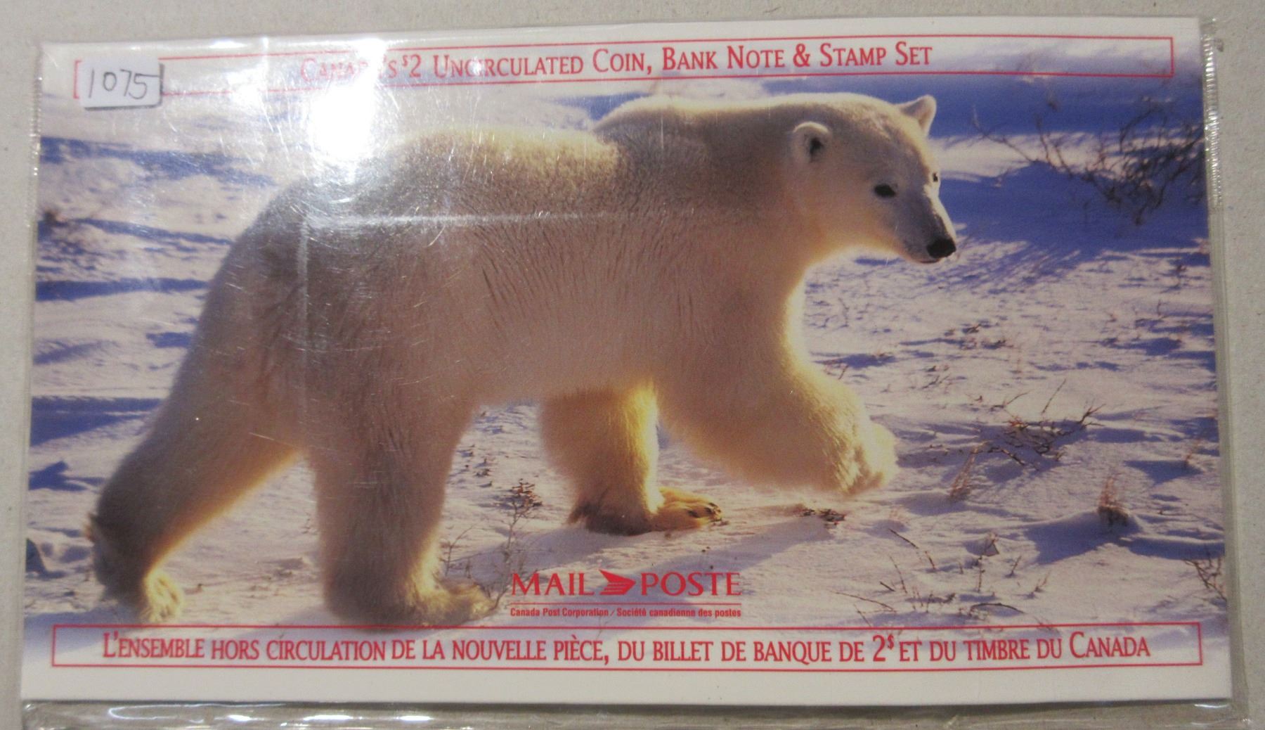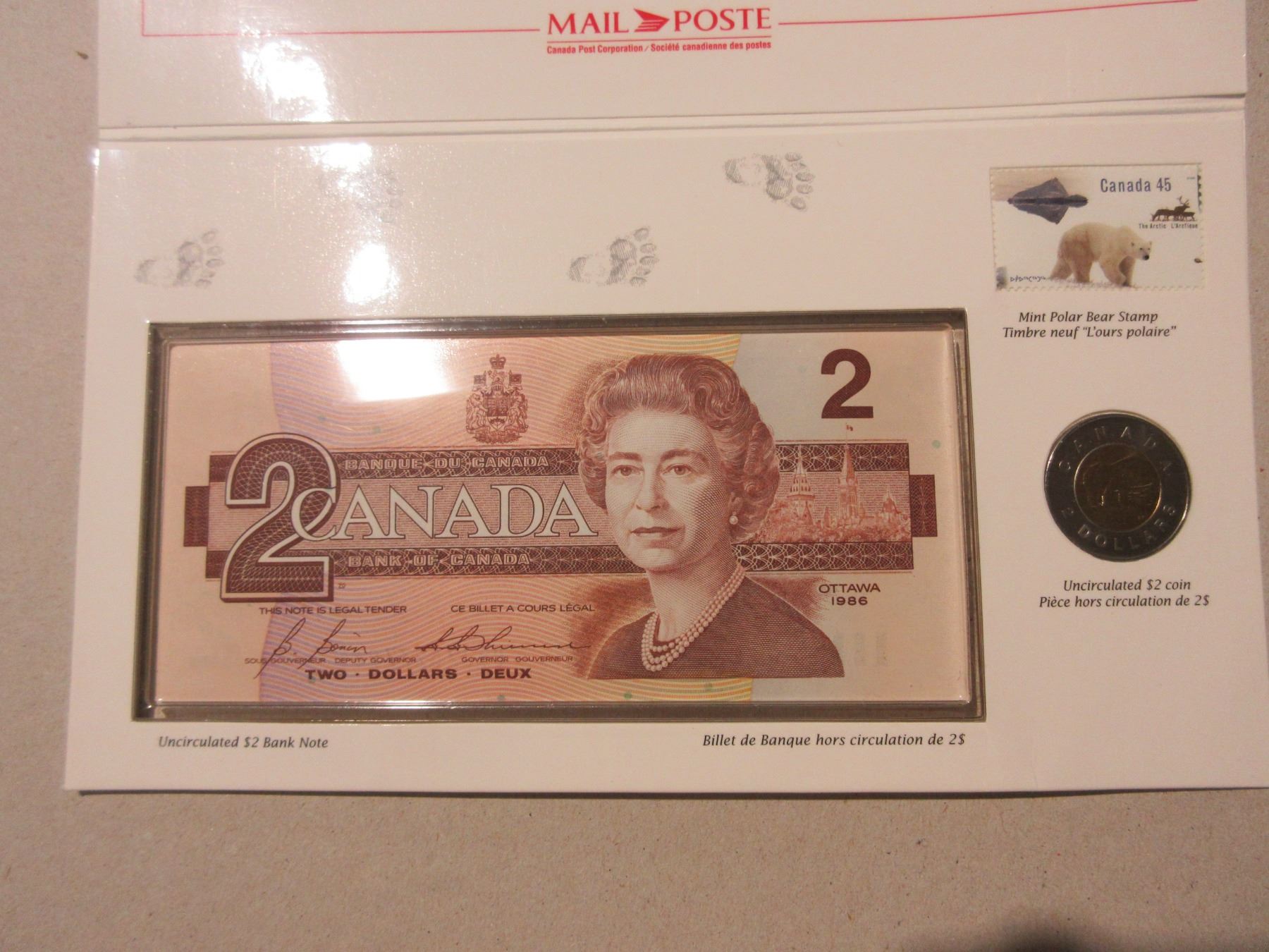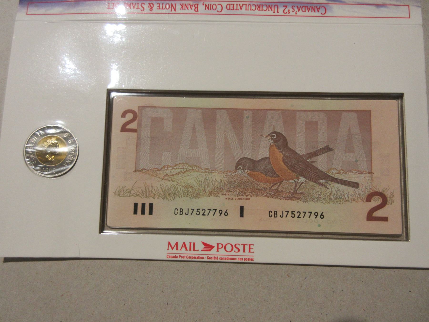 Canada’s $2 Uncirculated Coin, Bank Note & Stamp Set.
