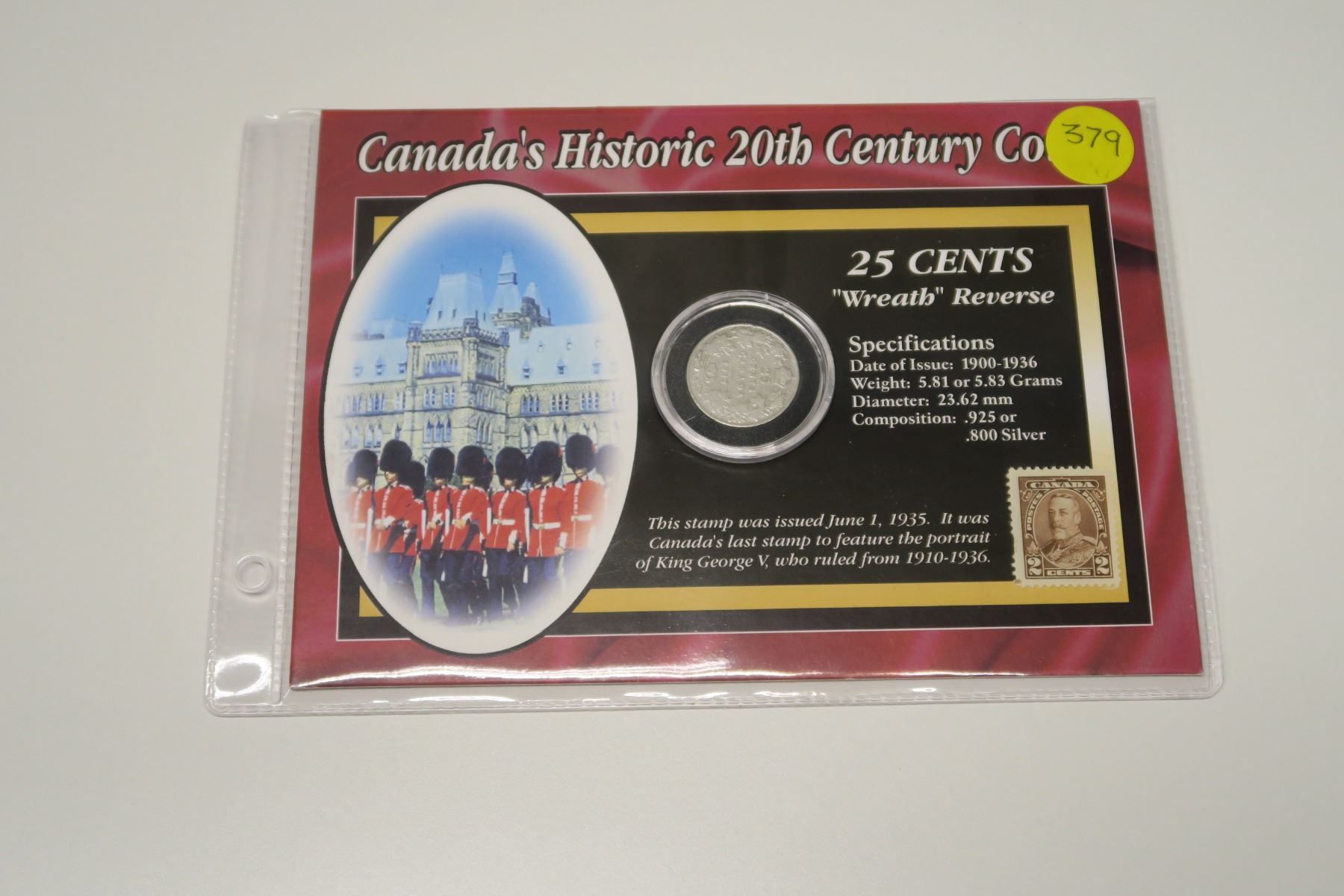 Canada’s Historic 20th Century Coins: 25 Cents “Wreath” Reverse. 1917 World War I Silver 25 Cents along with early George V 2 Cents Stamp. Morgan Mint folder.