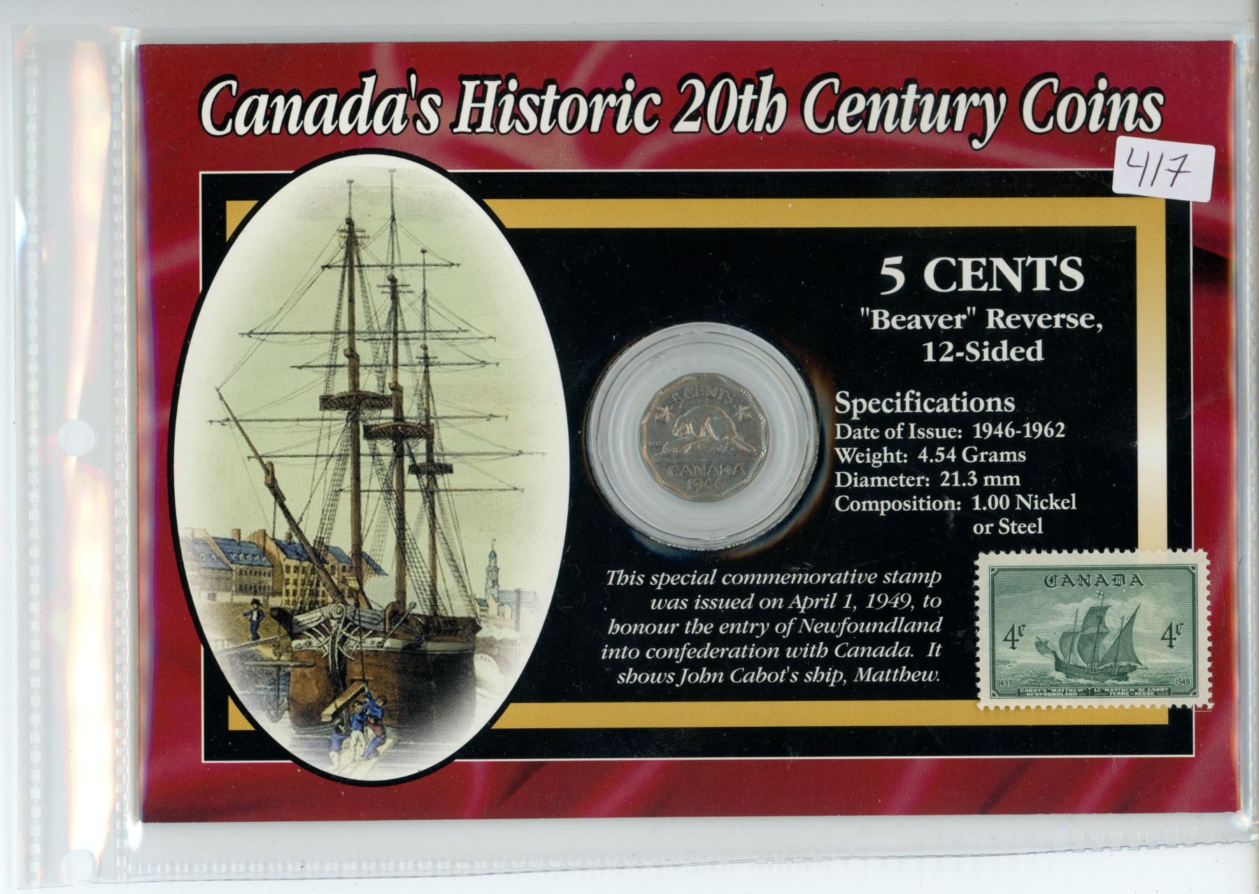 Canada’s Historic 20th Century Coins: 5 Cents Beaver Reverse. Includes 1949 Canadian Stamp to commemorate Newfoundland joining Canada in 1949.
