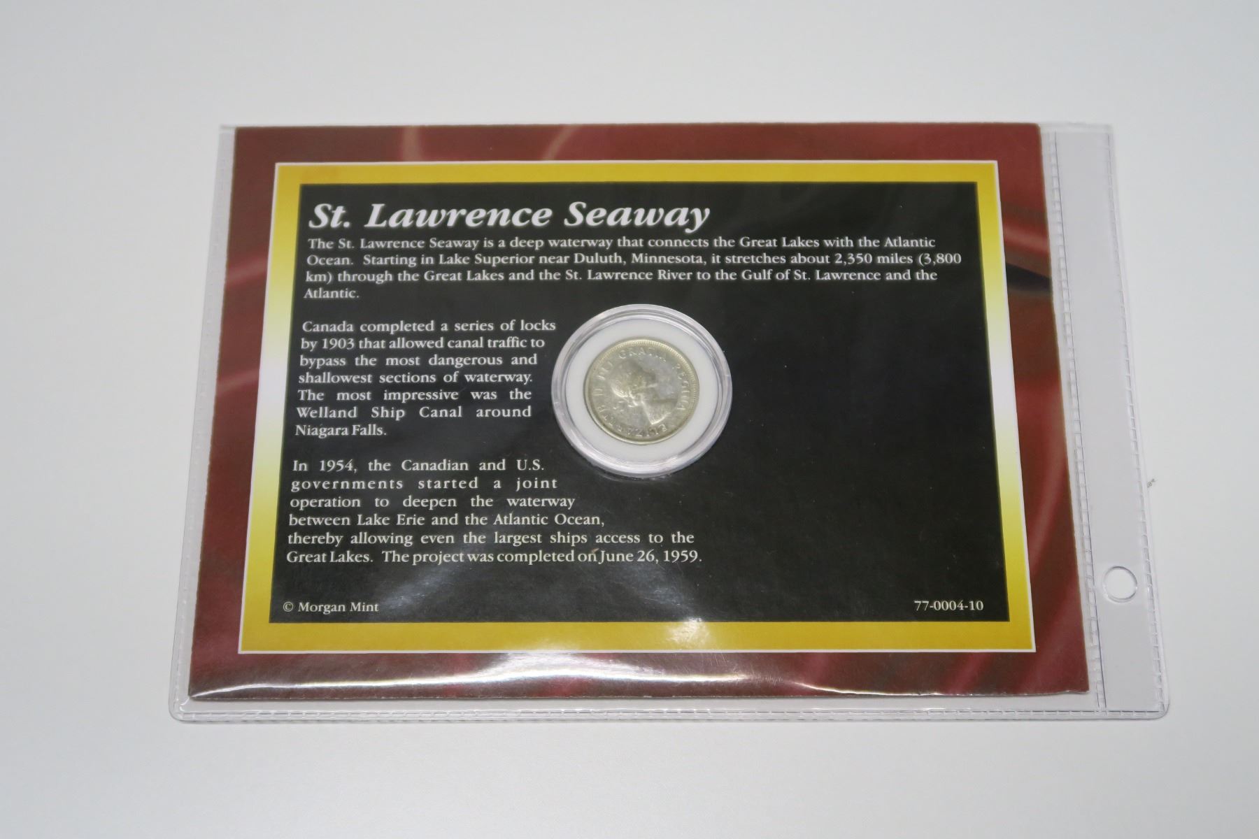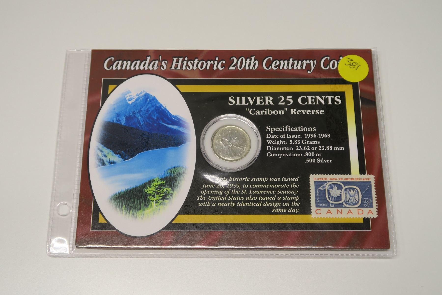 Canada’s Historic 20th Century Coins: Silver 25 Cents “Caribou” Reverse. 1963 Silver 25 Cents plus 5 Cents Stamp. Morgan Mint folder.