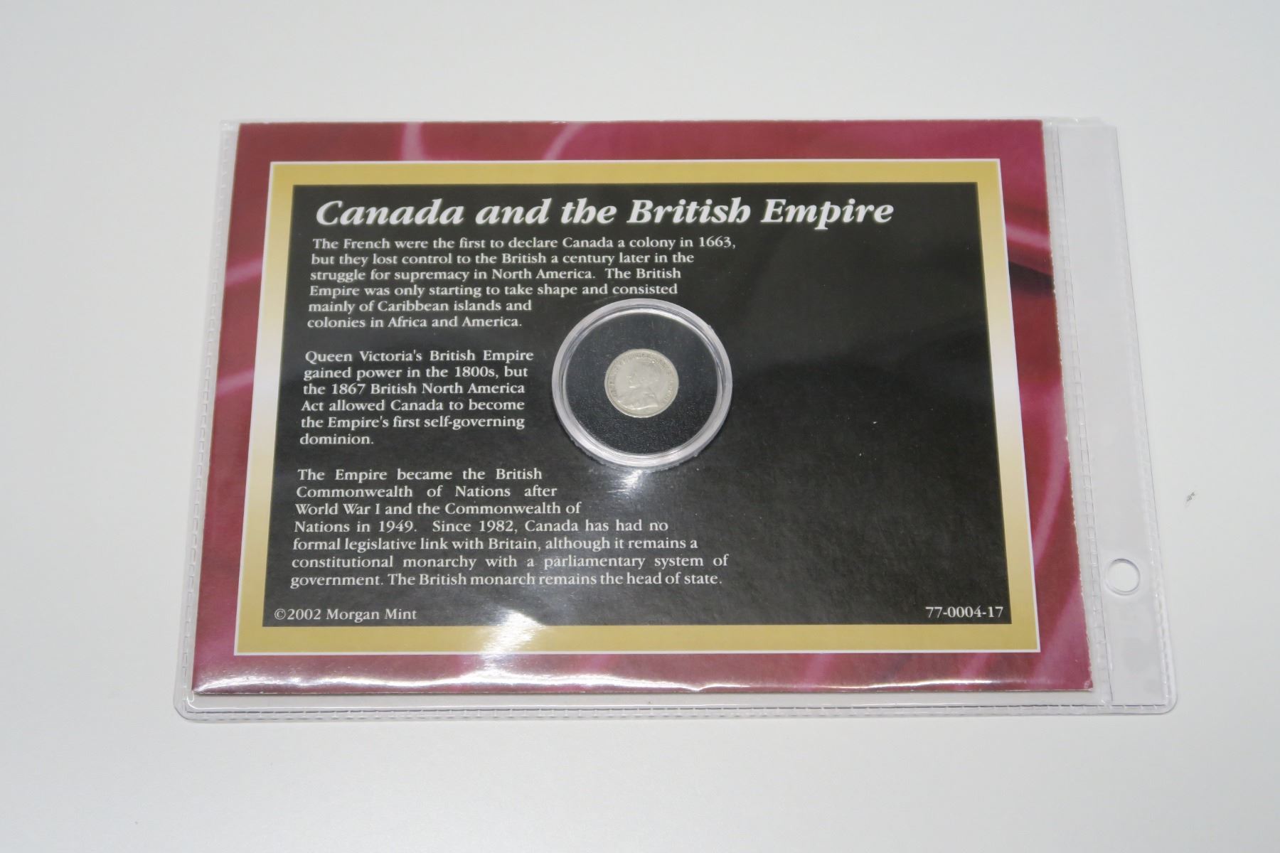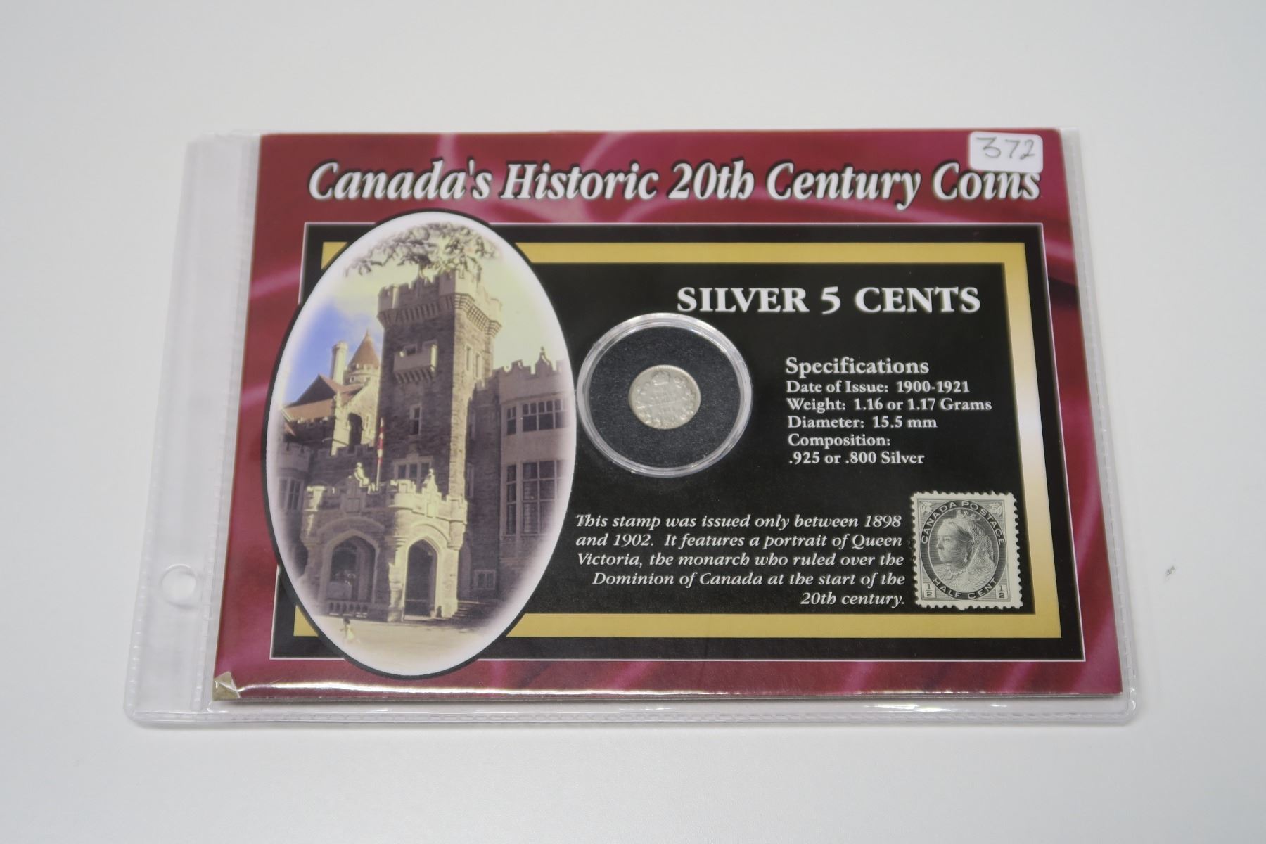Canada’s Historic 20th Century Coins: Silver 5 Cents. 1913 Silver 5 Cents along with early Queen Victoria ½ Cent Stamp. Morgan Mint folder.