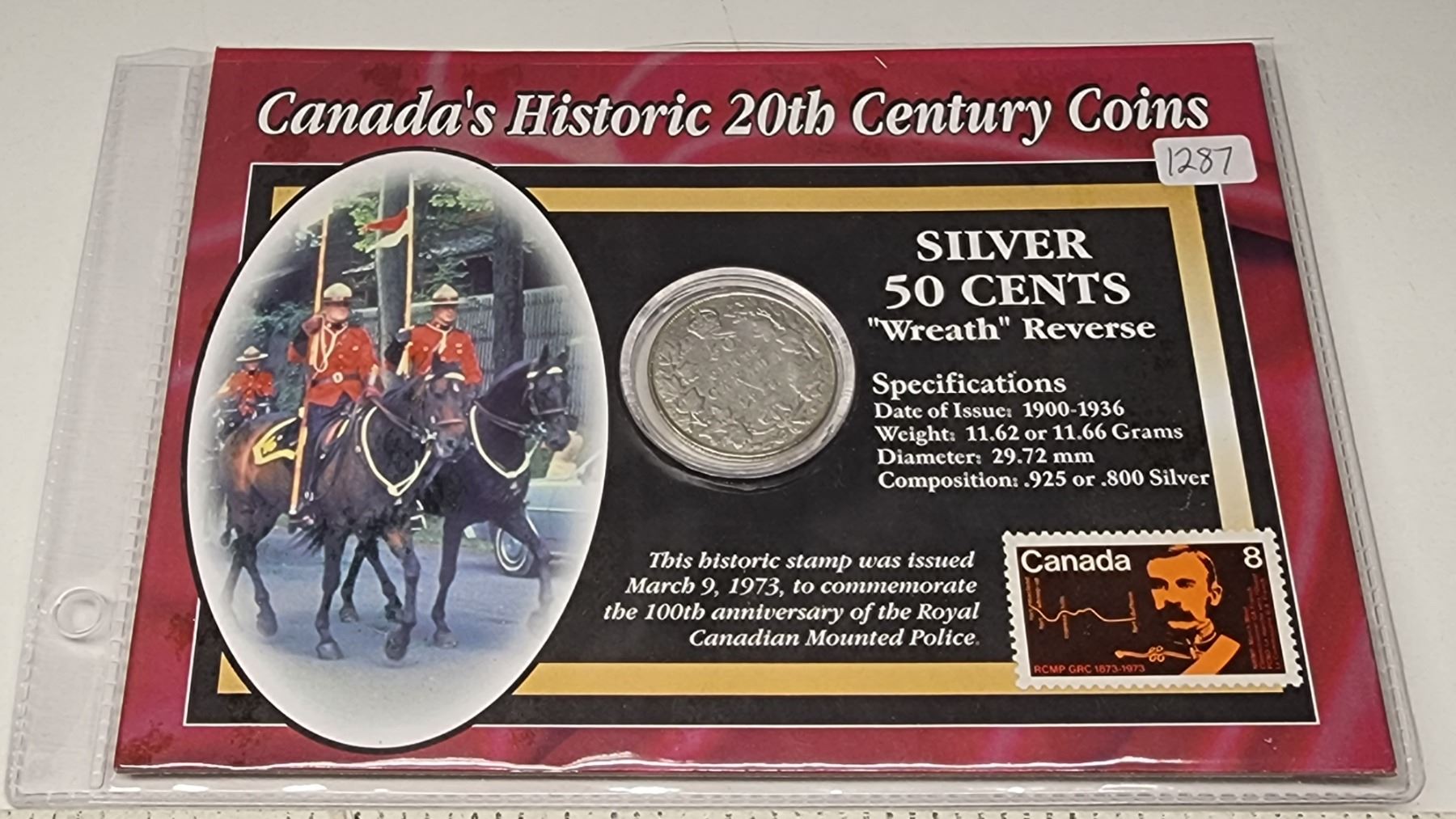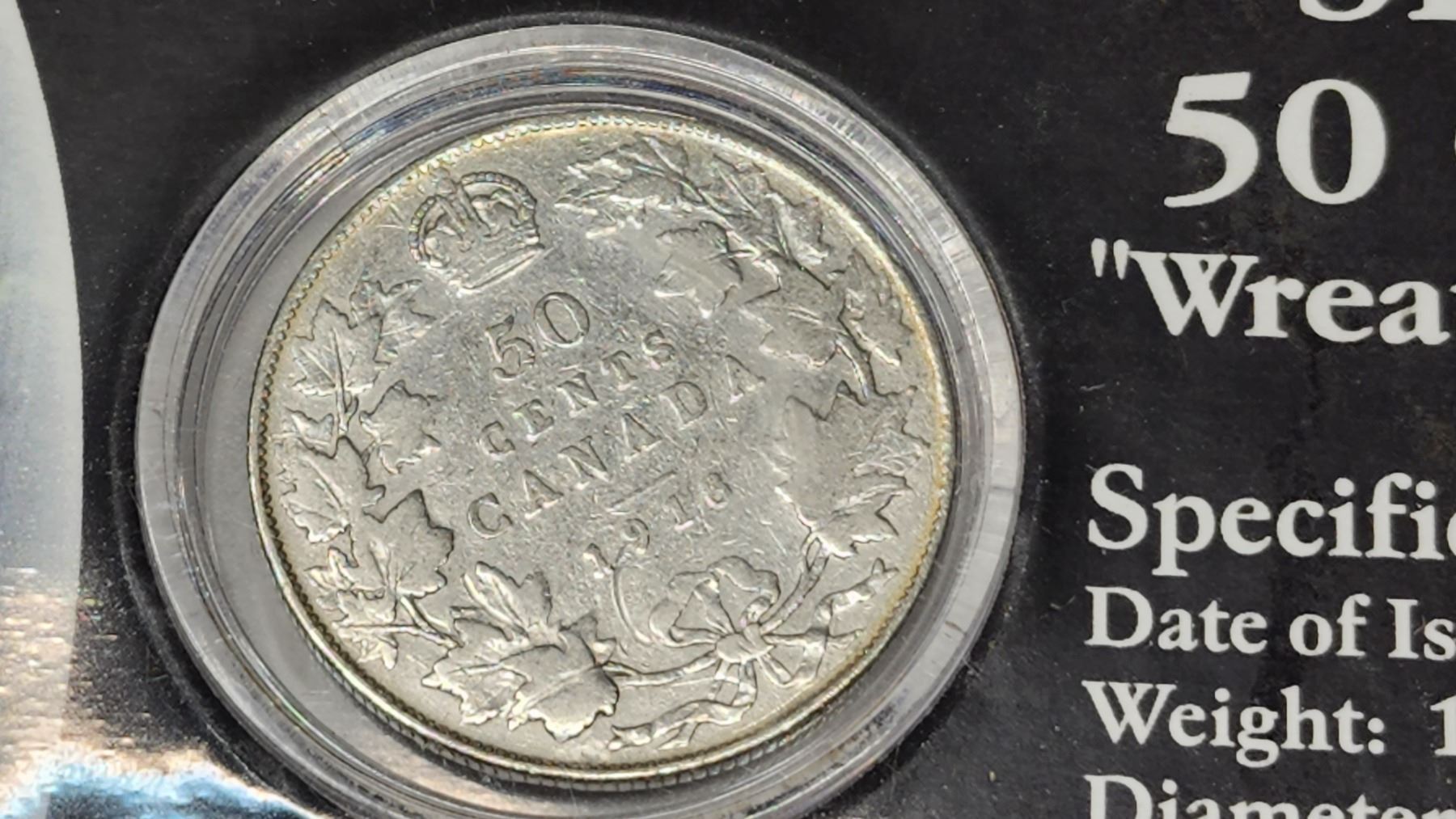 Canada’s Historic 20th Century Coins: Silver 50 Cents Wreath Reverse. Contains 1918 Silver 50 Cents with informational folder.