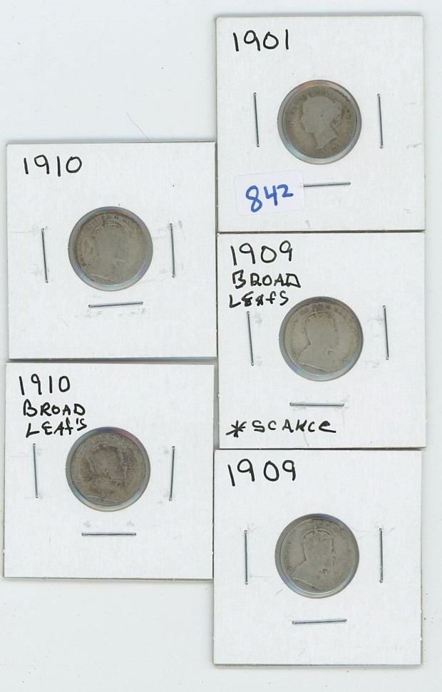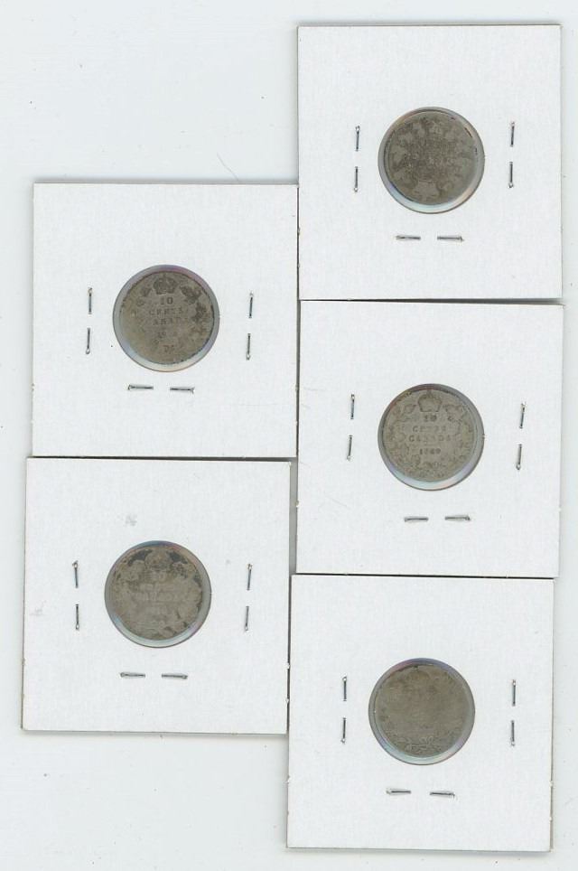 Canadian 10c 1901, 1909 x2, 1910 x2 Lot of 5