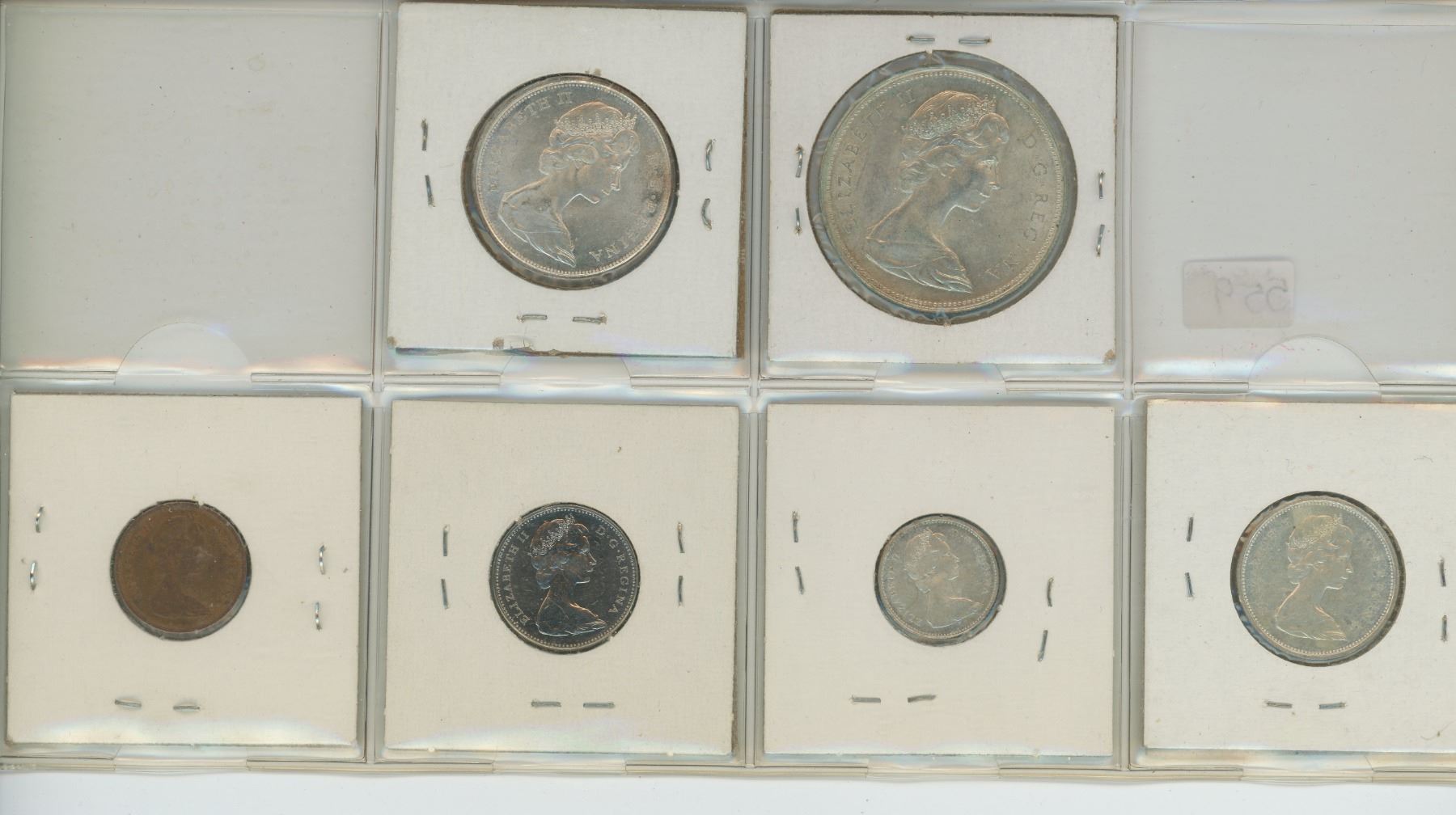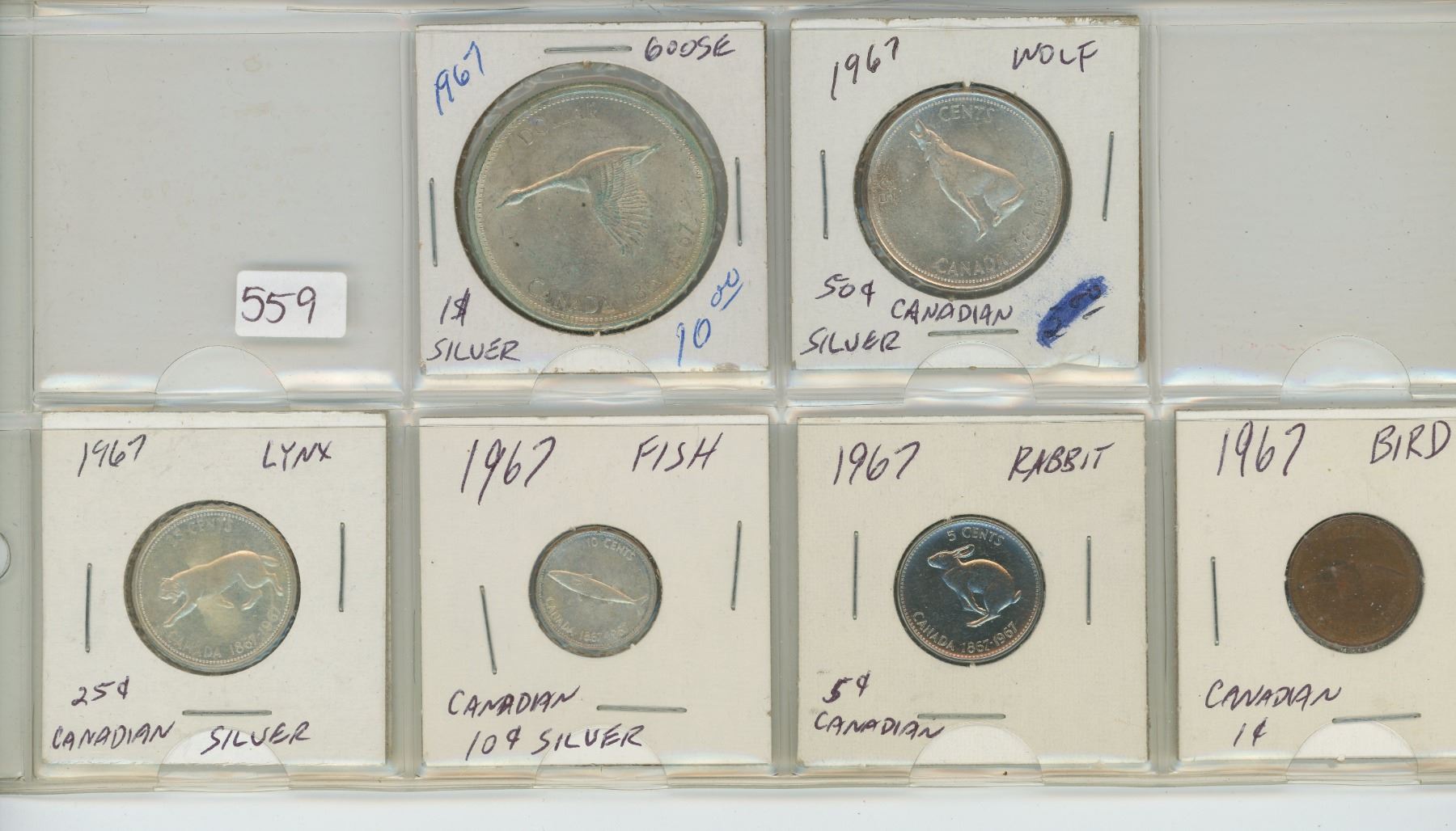 Canadian 1867-1967 coin set (Silver dollar, Silver 50 cent piece, Silver 25 cent piece, Silver 10 cent piece, Nickel 5 cent piece & Copper 1 cent piece),1- set 1967 coins