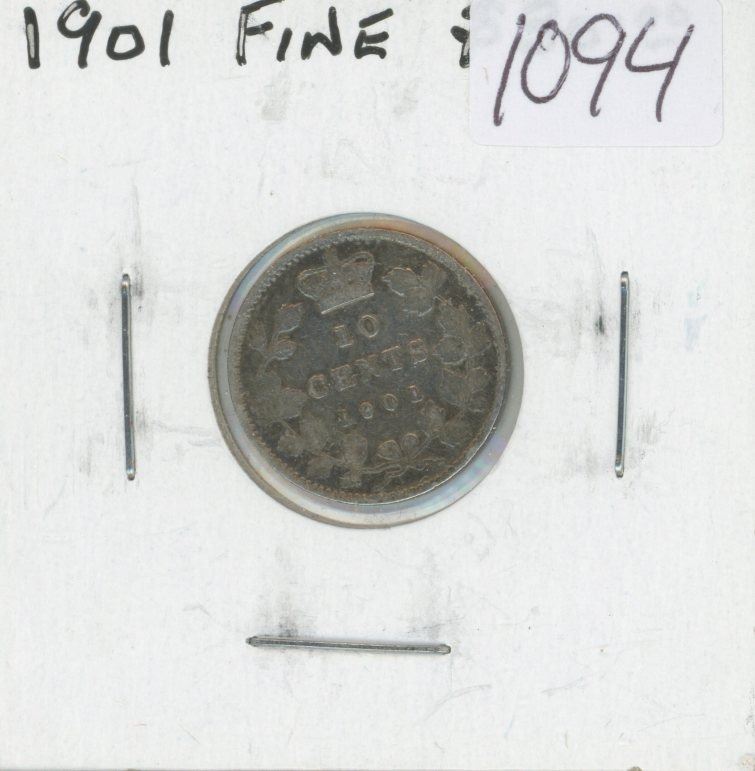 Canadian 1901 Victorian Silver 10 Cents. The last 10 Cents issued for Queen Victoria. F-12.