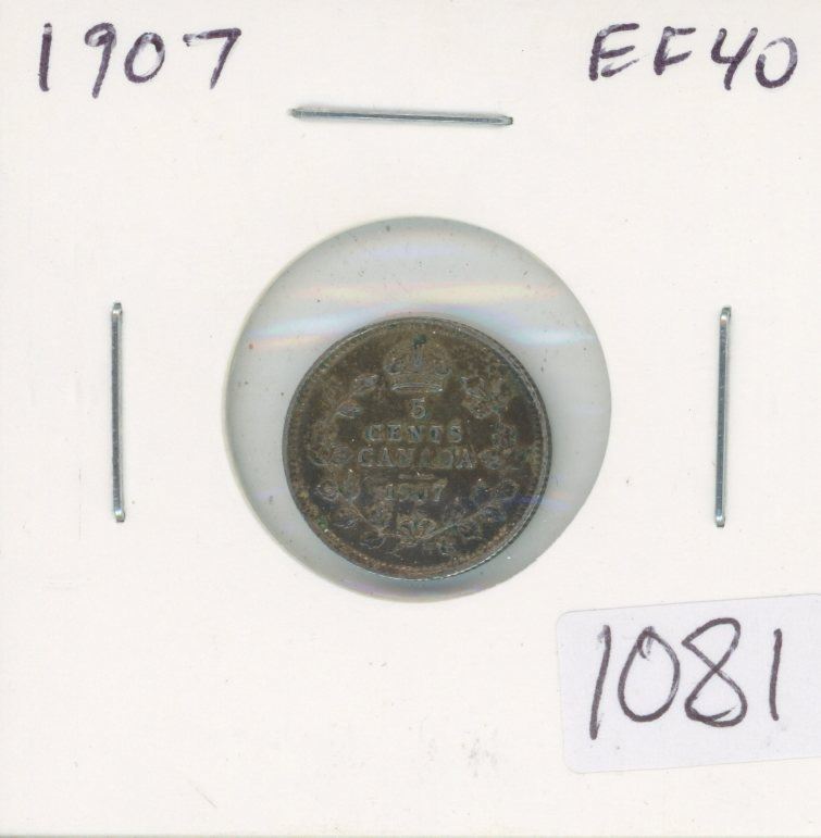 Canadian 1907 Edwardian Silver 5 Cents. EF-40. Nice.