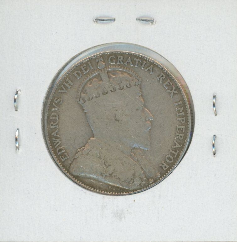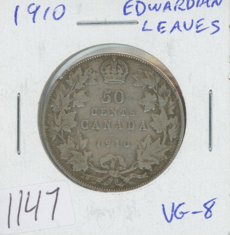 Canadian 1910 Edwardian Leaves Silver 50 Cents. The last Silver 50 Cents issued for King Edward VII. VG-8.