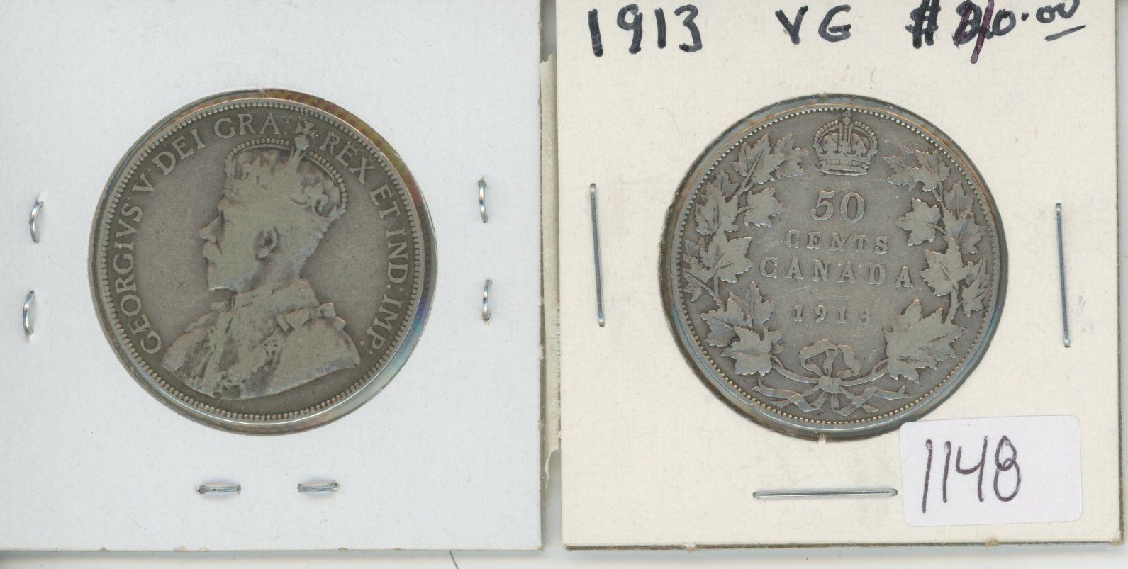 Canadian 1912 George V Silver 50 Cents. Key Date. Mintage of 285,867. VG-8.Canadian 1913 George V Silver 50 Cents. Key Date. Mintage of 265,889. VG-8.