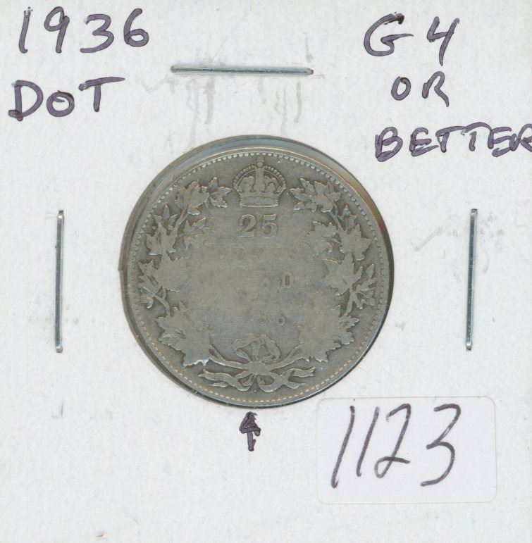 Canadian 1936 Dot George V Silver 25 Cents. Scarce Dot Variety, missing from most collections. G-4 or better.