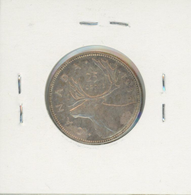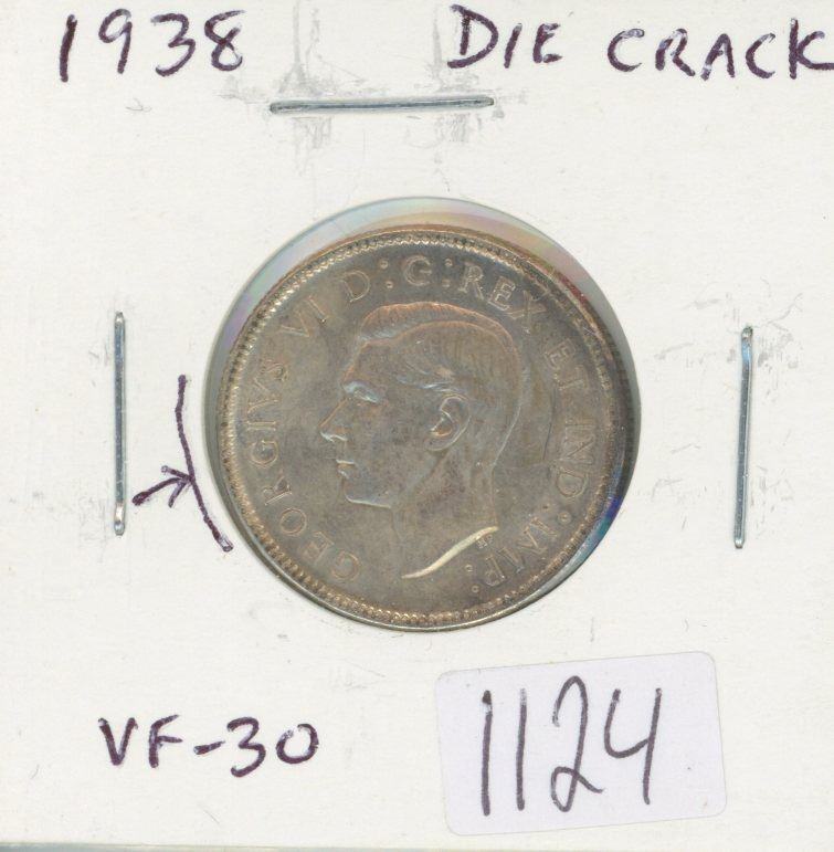 Canadian 1938 George VI Silver 25 Cents with Obverse Die Crack Through ORGIVS. Scarce Variety. VF-30. Nice.