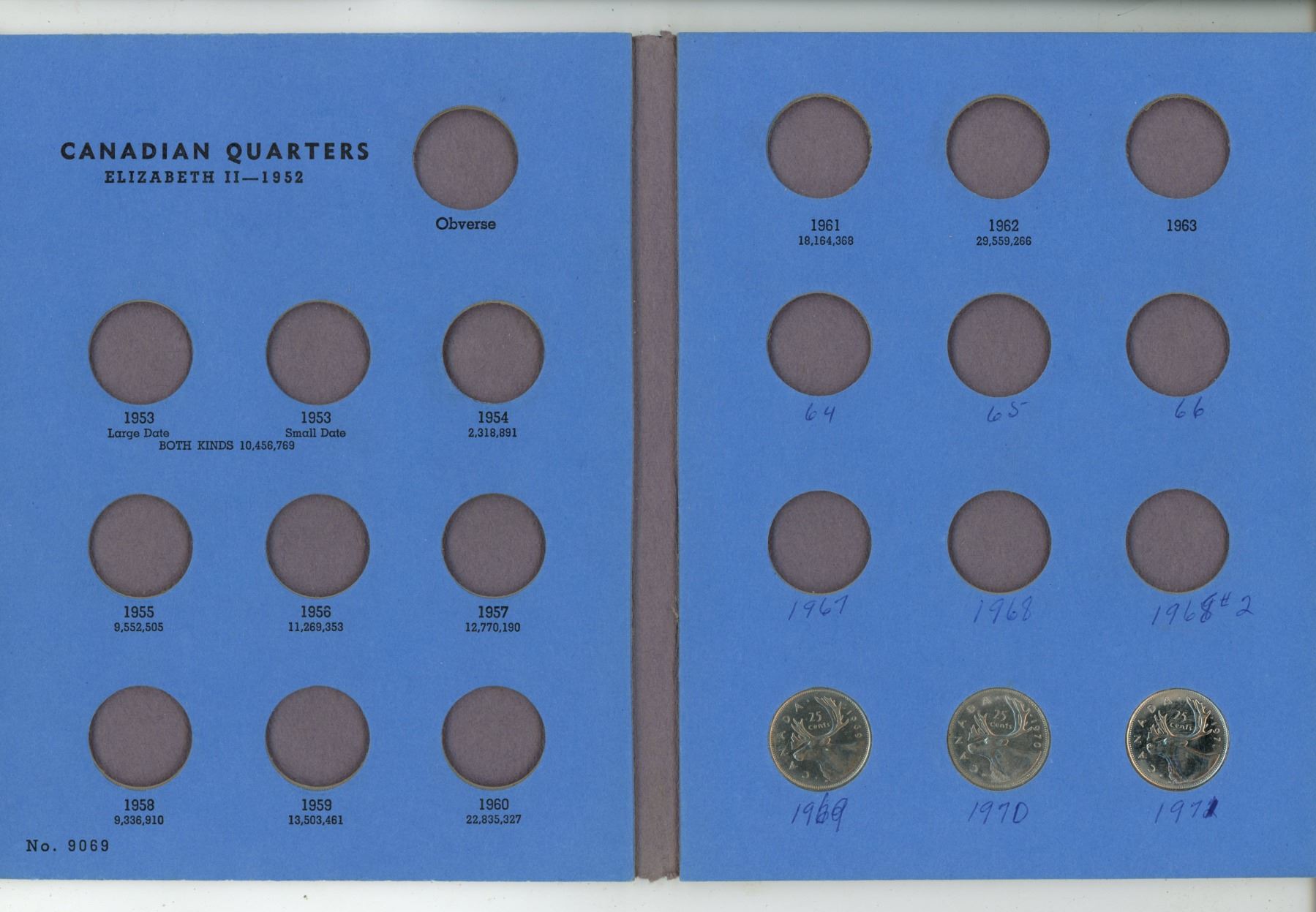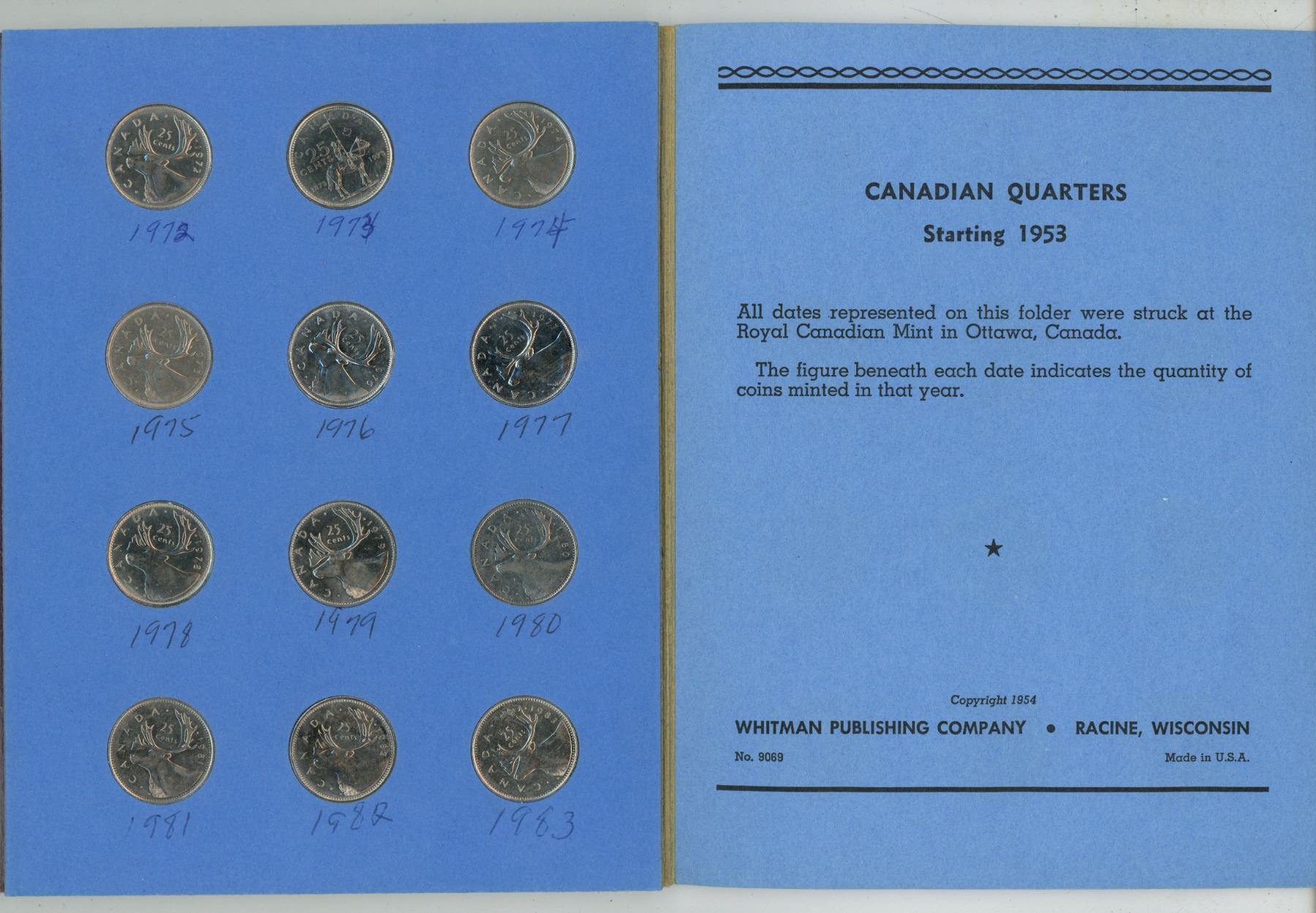 Canadian 25 Cents Collection 1969 to 1983. Housed in a blue Whitman folder.