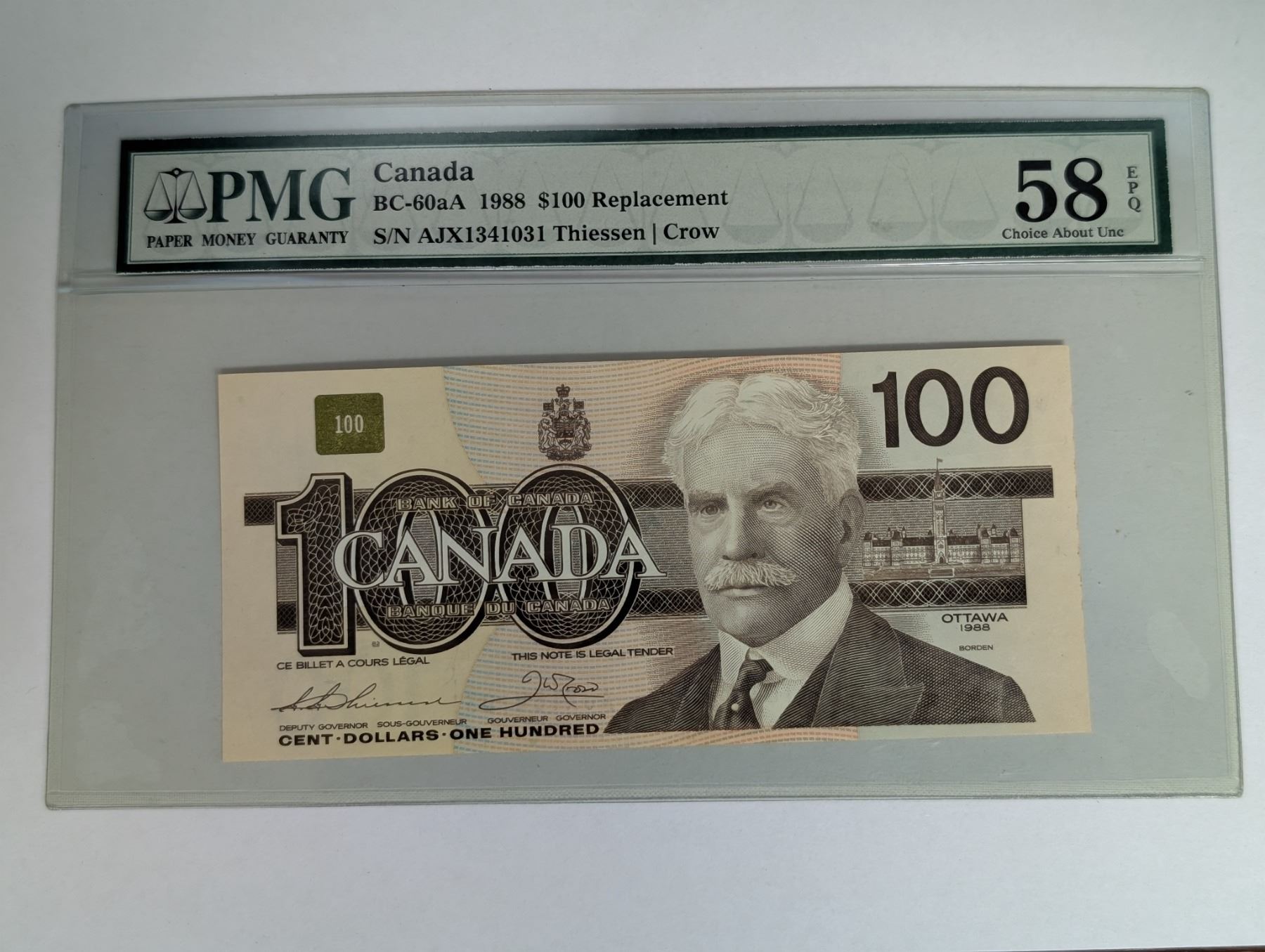 Canadian BC-60aA 1988 100 Dollar Replacement S/N AJX1341031 Thiessen/Cow 58 EPQ