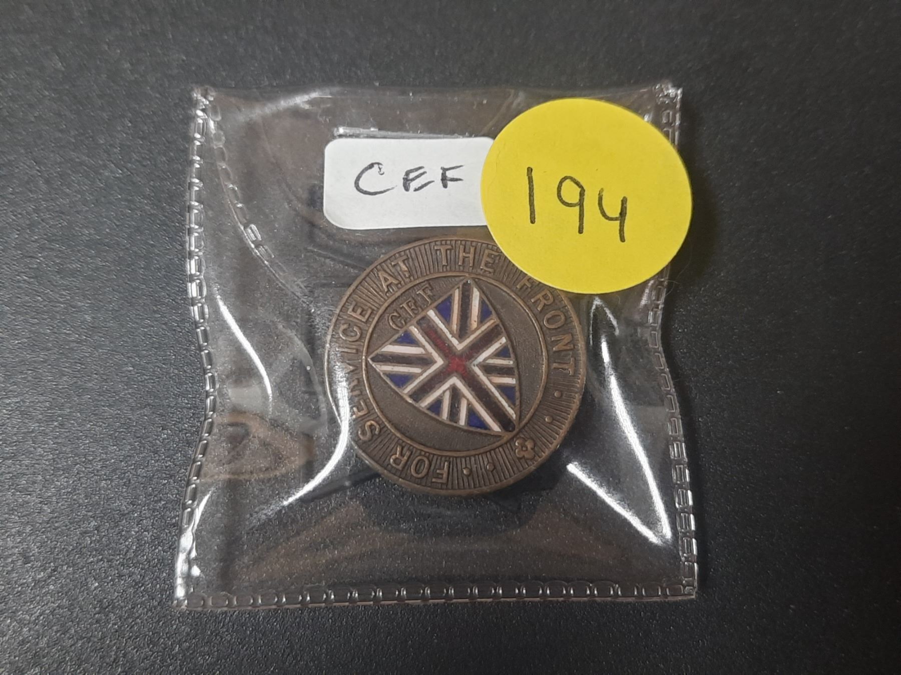 Canadian Expeditionary Force Pin that reads For Service at the Front. Was worn by returning CEF members to show they had served. Enameled.