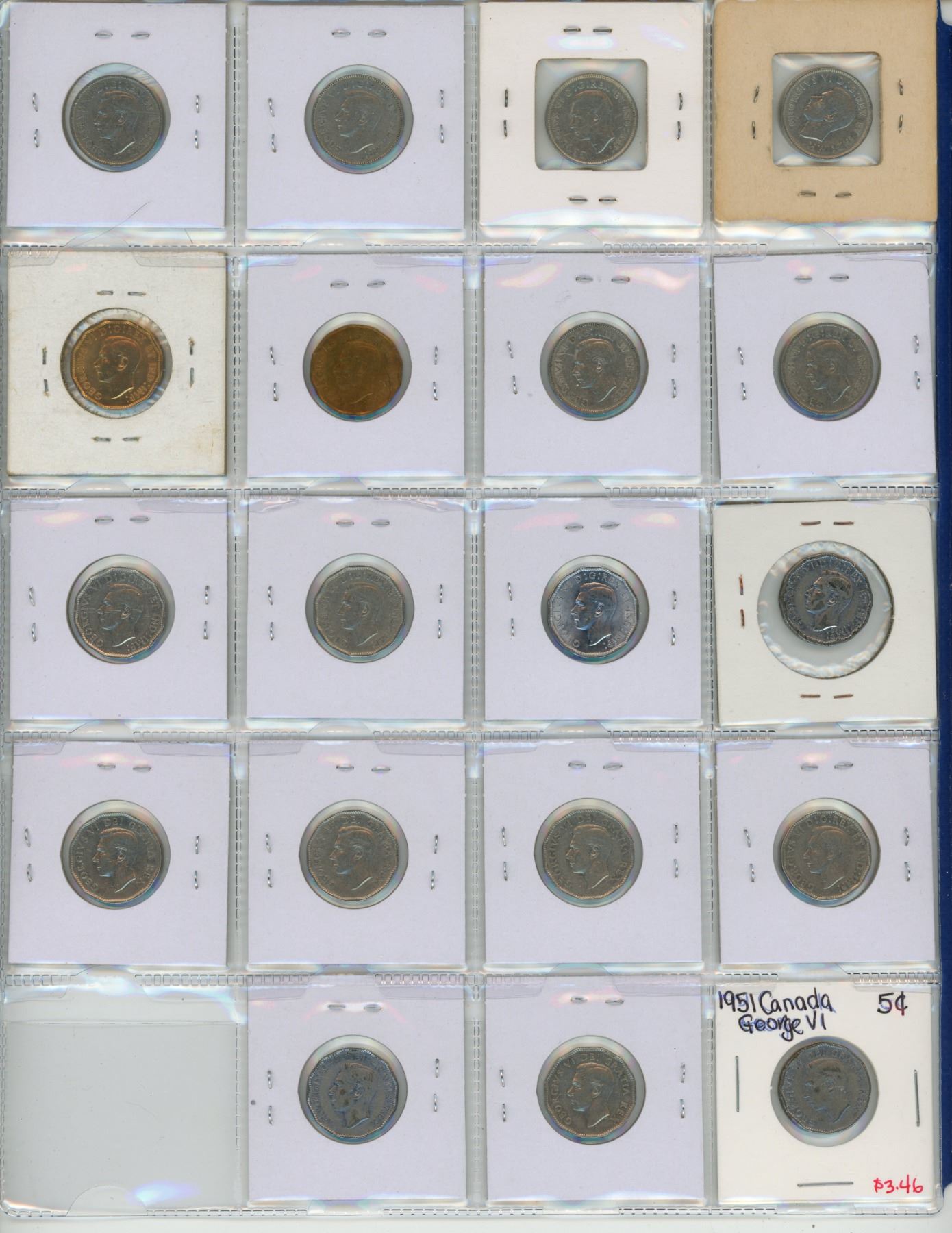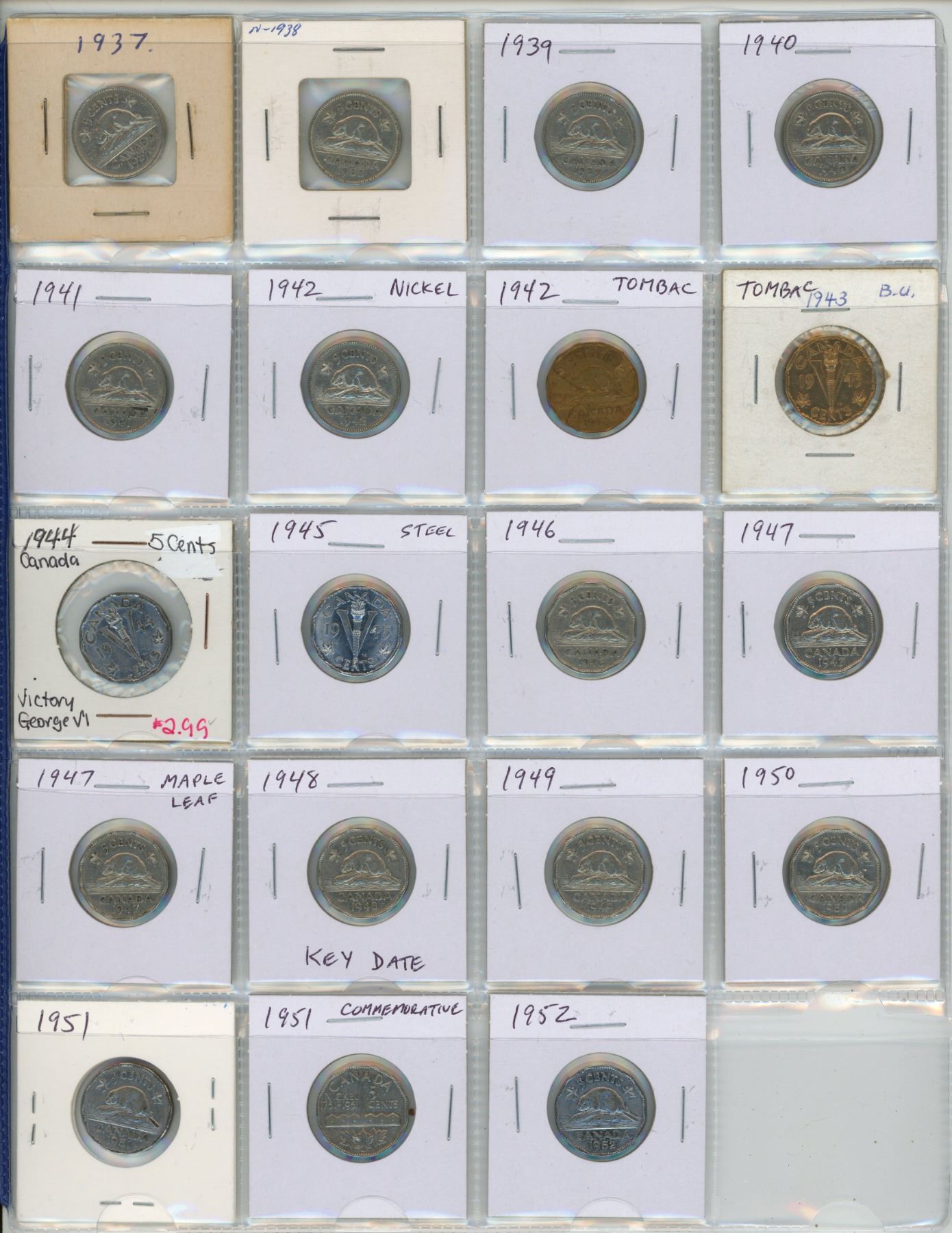 Canadian George VI 5 Cents Collection. Includes 1937, 1938, 1939, 1940, 1941, 1942 Nickel, 1942 Tombac, 1943 Tombac, 1944 Steel, 1945 Steel, 1946, 1947, 1947 Maple Leaf, 1948, 1949, 1950, 1951, 1951 Commemorative & 1952.