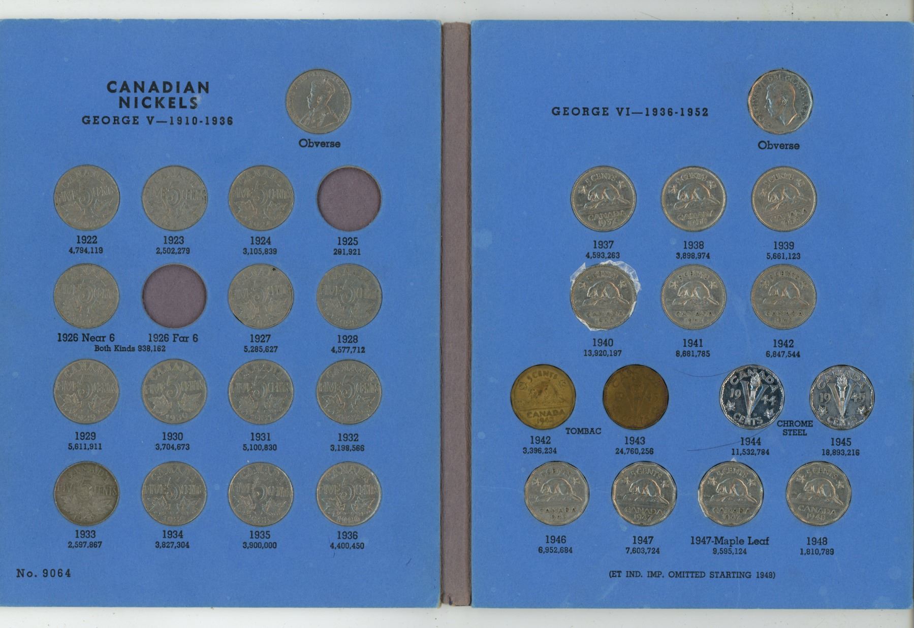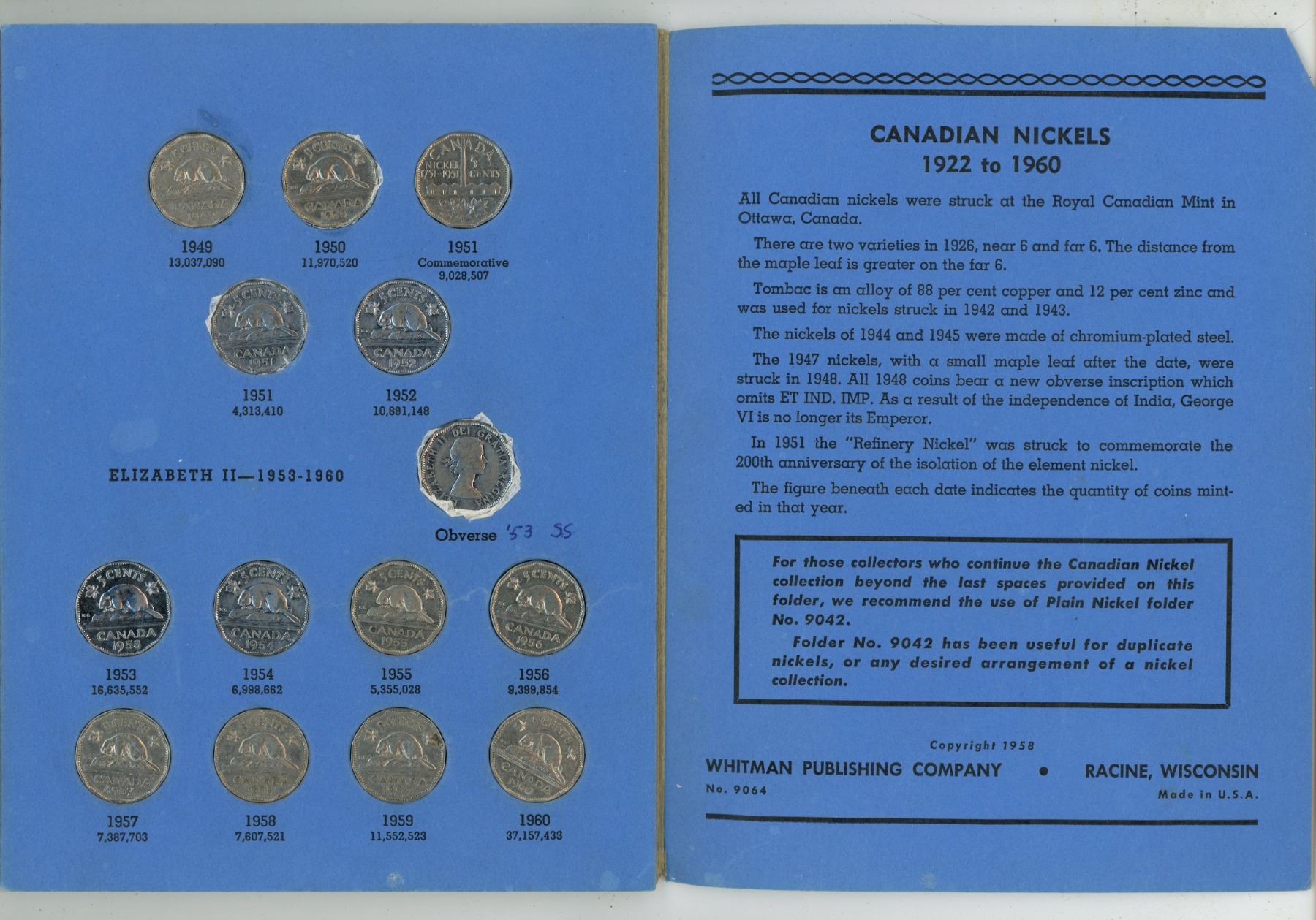 Canadian Nickel 5 Cents Collection 1922 to 1960. Missing only 1925 and 1926 Far 6. Housed in a blue Whitman folder.