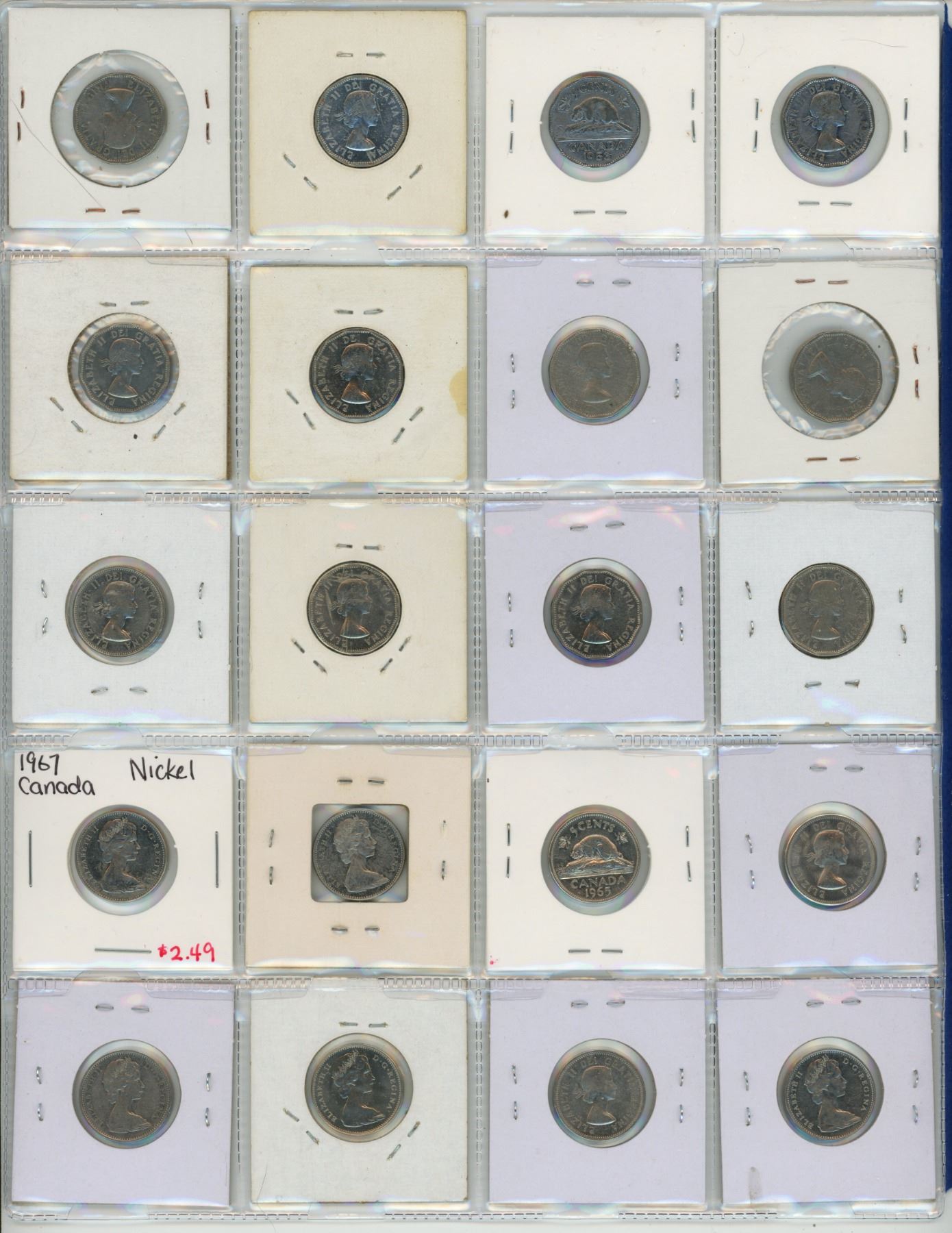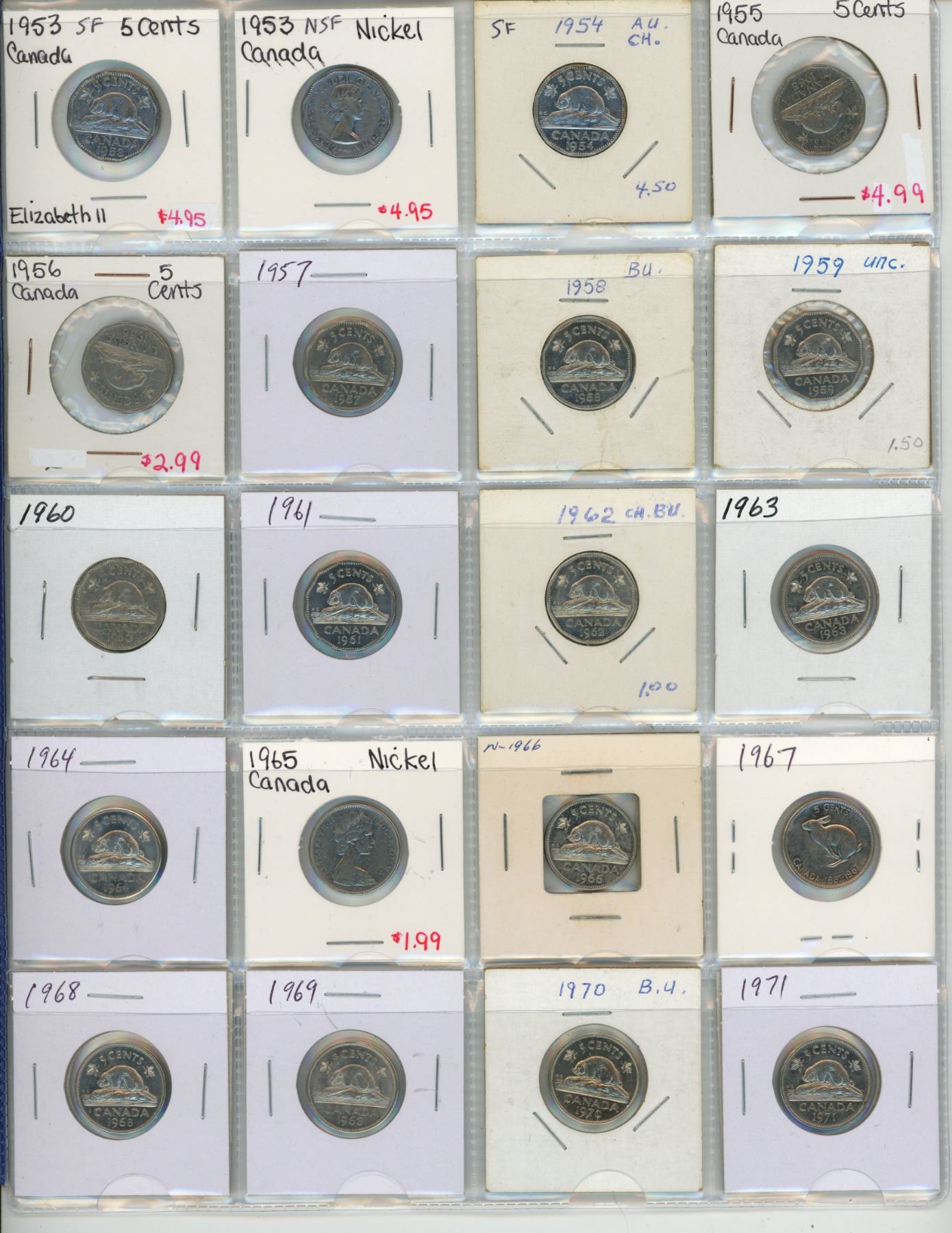 Canadian Queen Elizabeth 5 Cent Collection. Includes 1953 Shoulder Fold, 1953 No Shoulder Fold, 1954 Shoulder Fold, 1955, 1956, 1957, 1958, 1959, 1960, 1961, 1962, 1963, 1964, 1965, 1966, 1967, 1968, 1969, 1970 & 1971.
