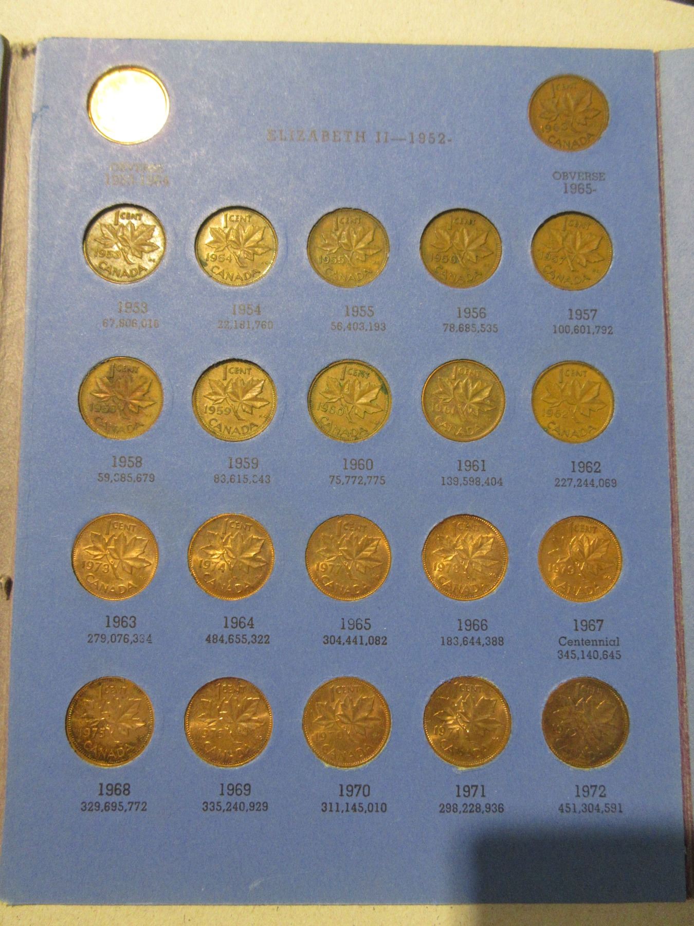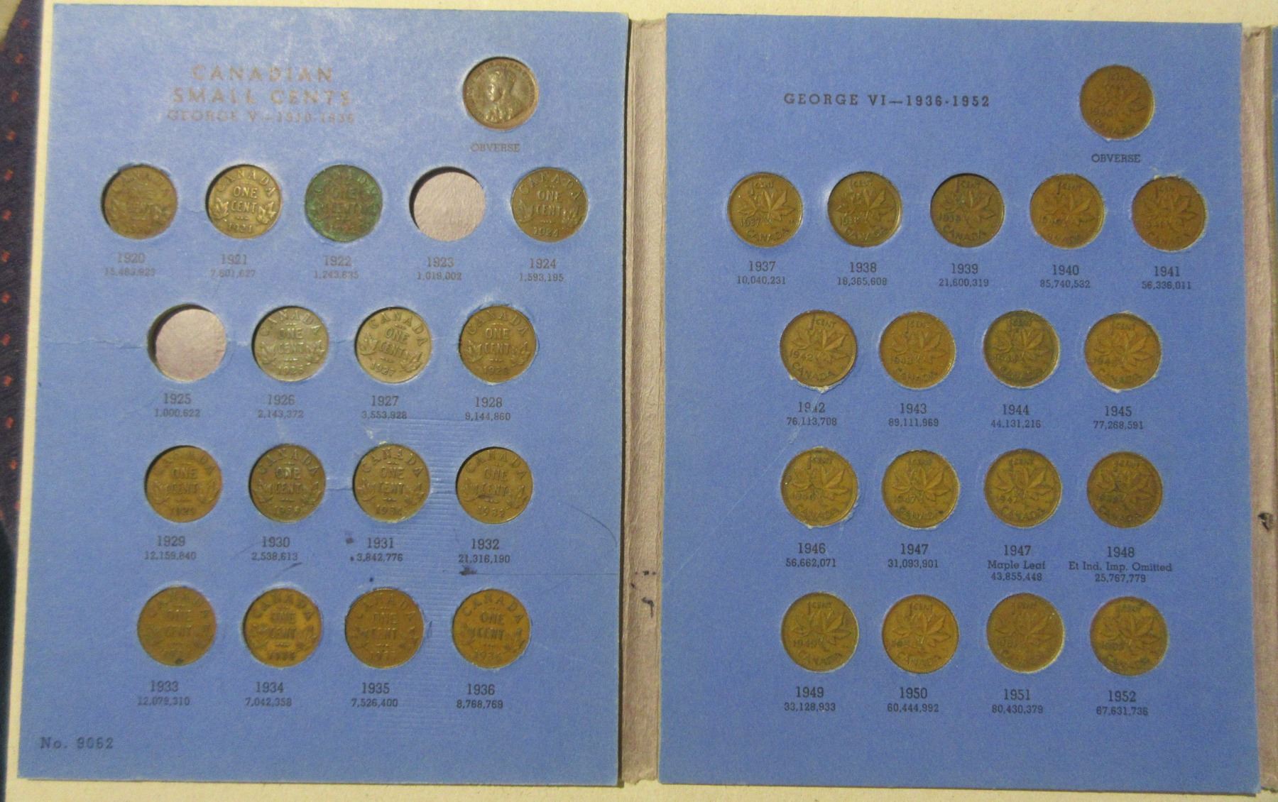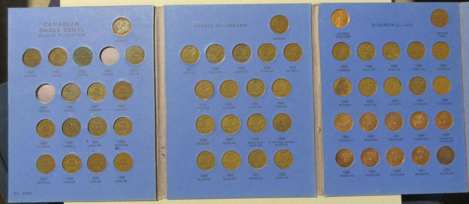 Canadian Small Cent Collection 1920 – 1972. Missing only 1923 & 1925, both Key Dates. Housed in a blue Whitman folder.