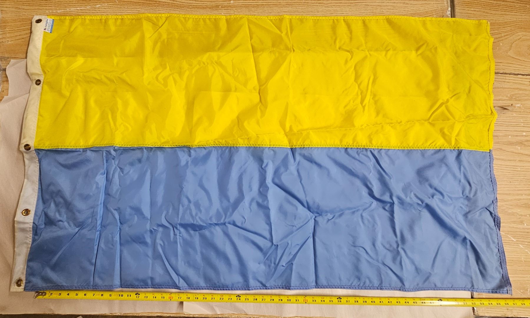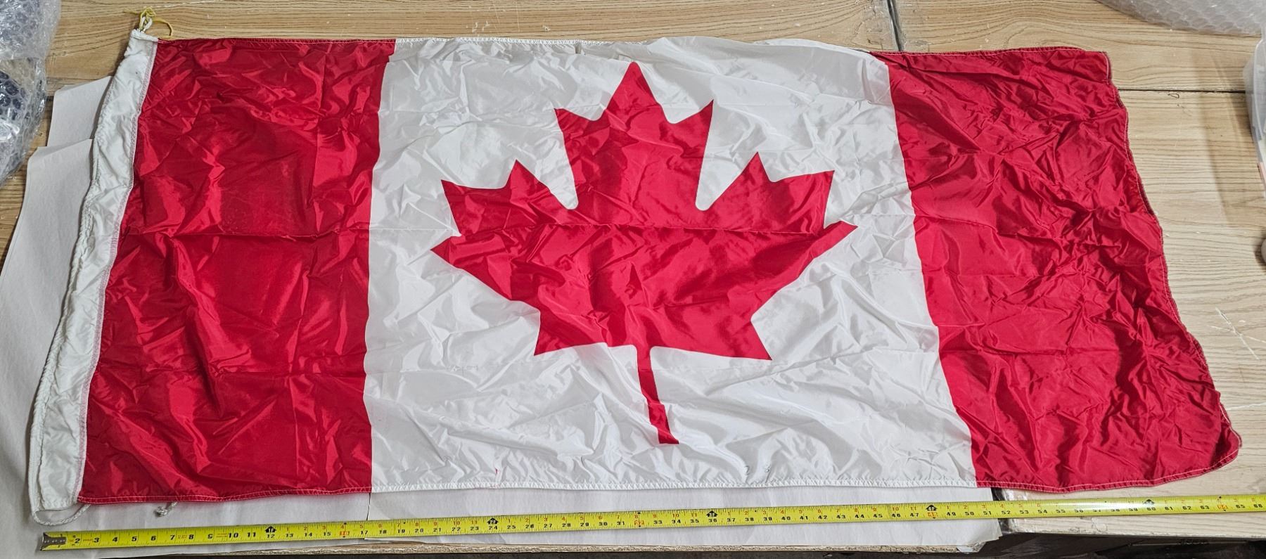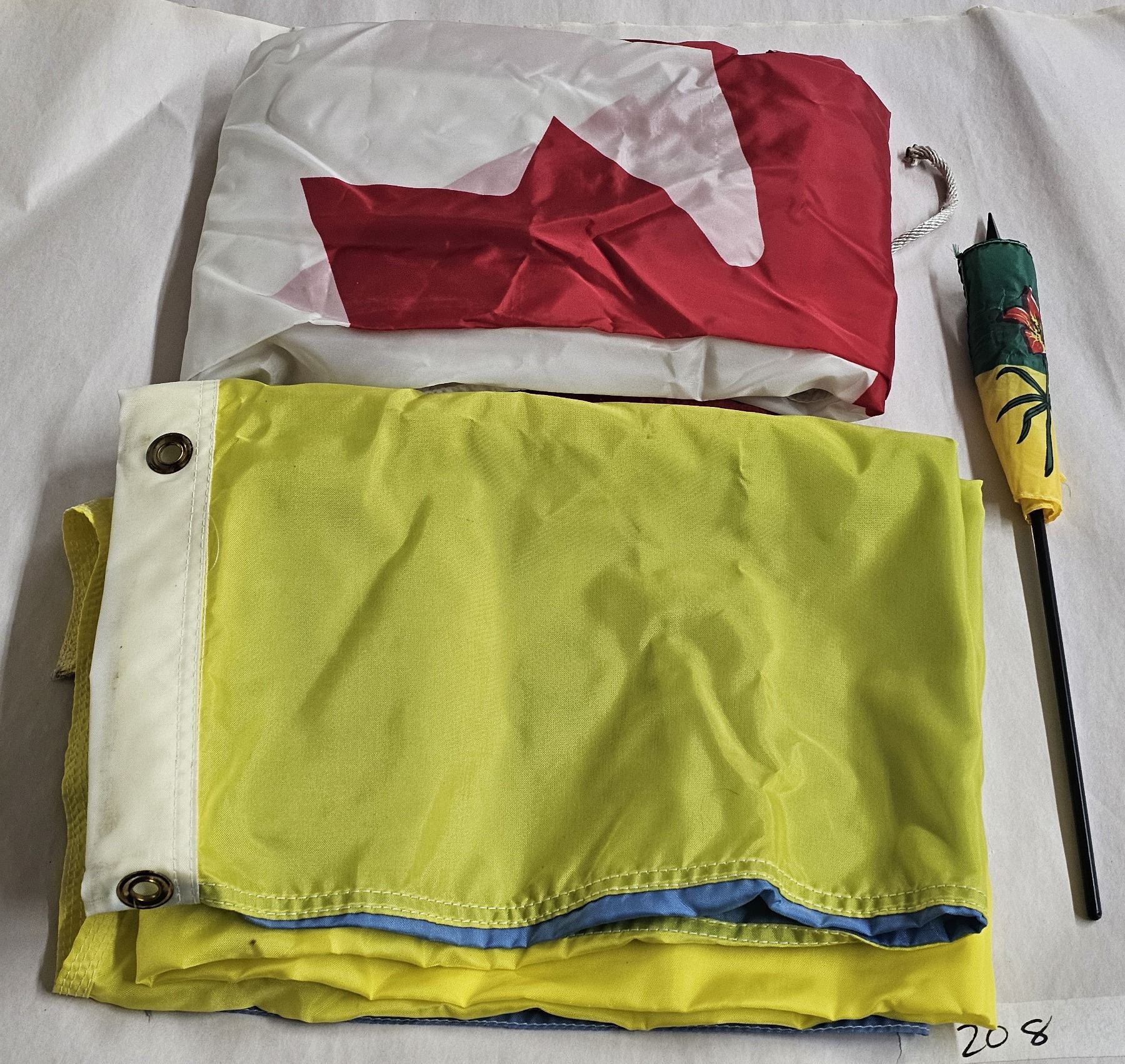 Canadian flag, Ukrainian flag and small Saskatchewan flag, all made of cloth and in good condition.